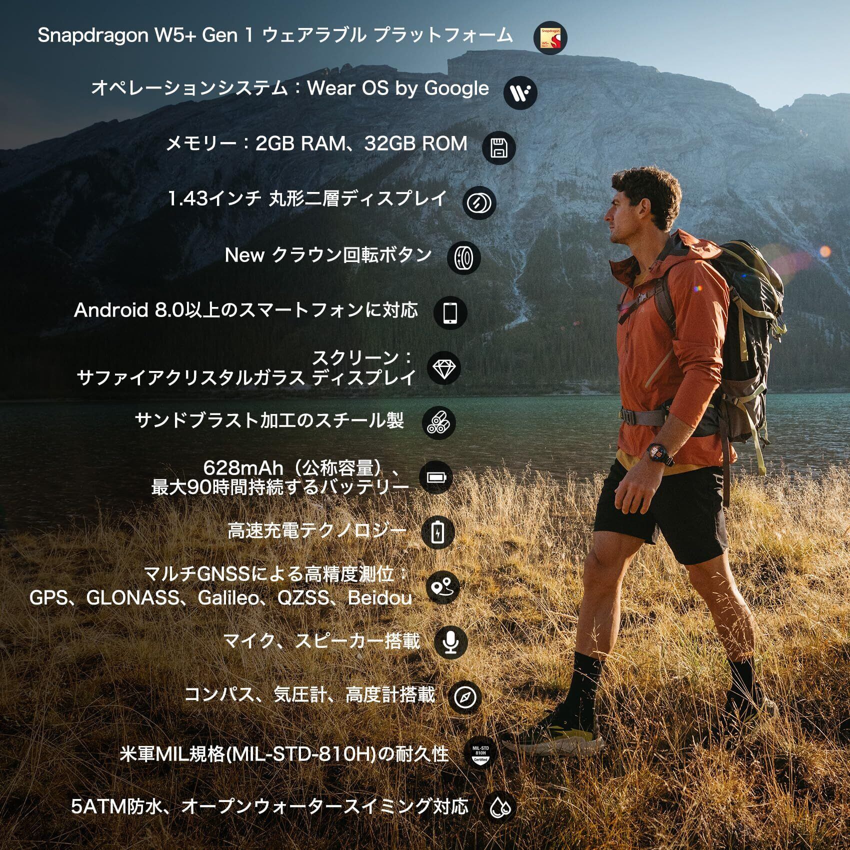 【2022最新】Ticwatch Atlas スマートウォッチ Wear OS by Google Android グーグル対応スマートウォッチ 5ATM防水 腕時計 アウトドア ランニング ロングバッテリー コンパス 気圧計 高度計搭載 ブラック