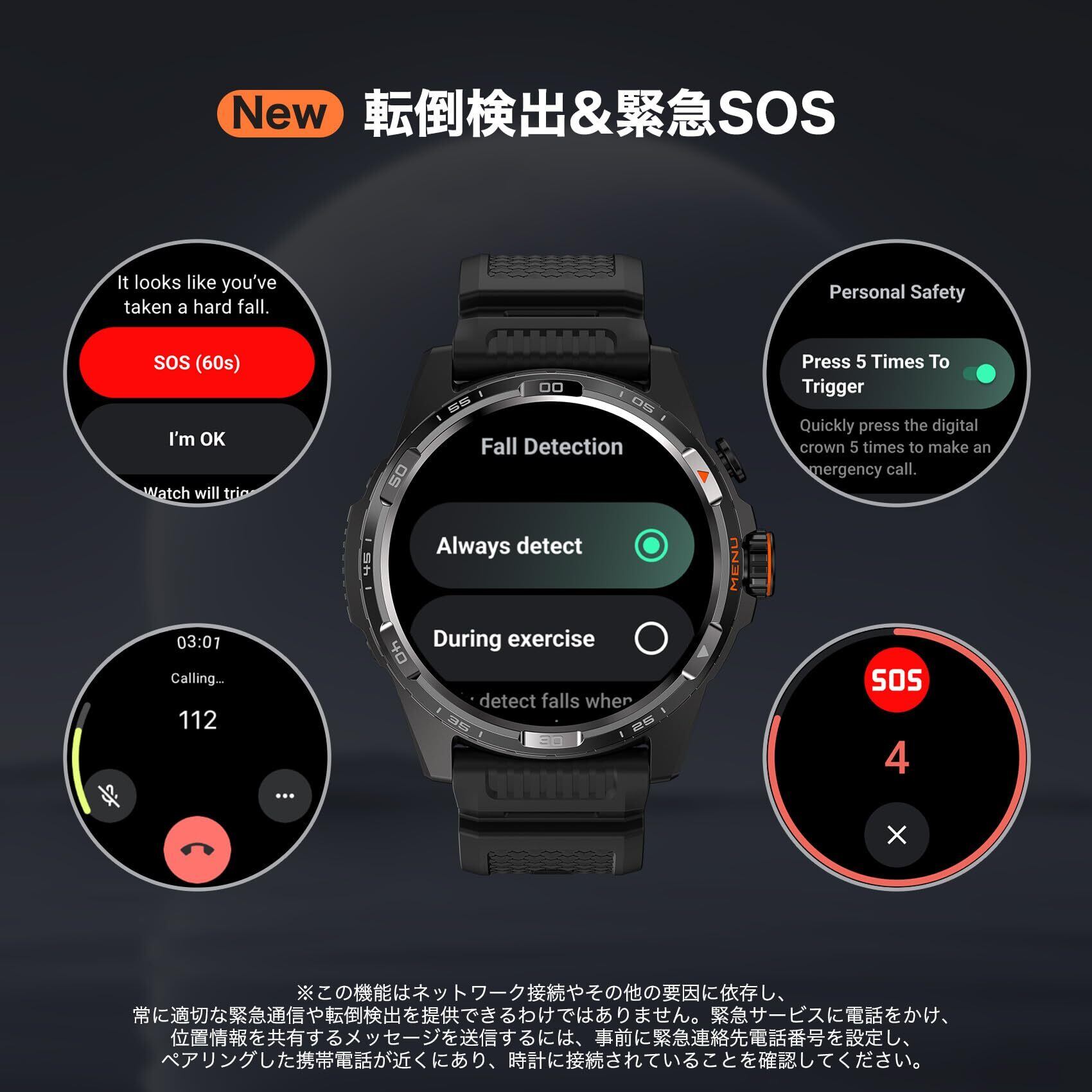 【転倒検出&緊急SOS】:高度なモーションセンサーと AI アルゴリズムを搭載したTicWatch Atlasは、転倒を瞬時に検出します。転倒した時や衝突事故に遭った時、ウォッチが自動的に緊急SOSを発信します。また位置情報が共有され、居場所をすぐに見つけられます。