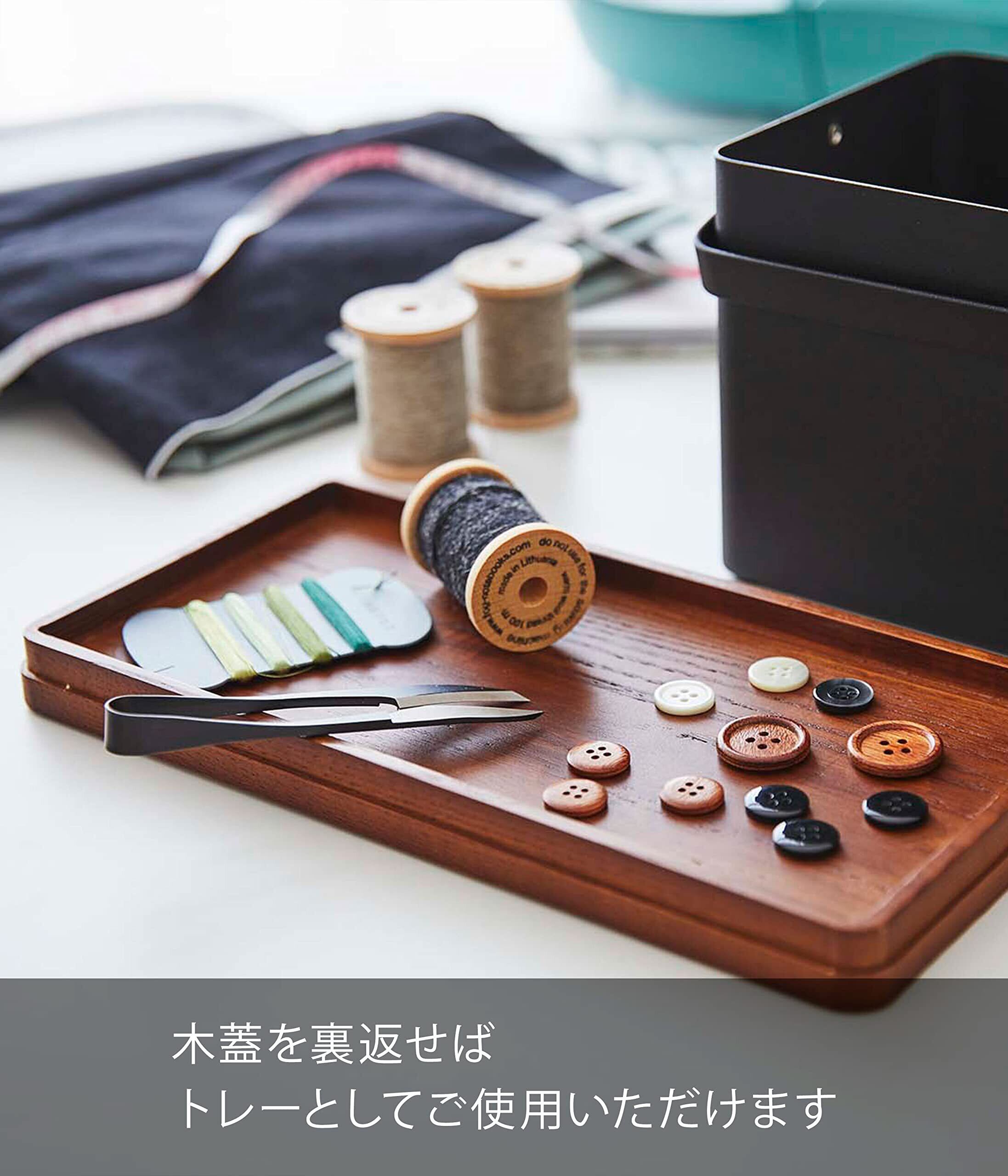 毎日の暮らしにちょうどいい。モダンでスタイリッシュなソーイングボックス。トレーは取り出すことができるので、卓上で道具類を散らかさずに裁縫できます。上段のトレーはスライド式。縦・横どちらの向きでも収納できます。木蓋を裏返せばトレーとしてご使用いただけます。持ち運びに便利な取っ手付き。
