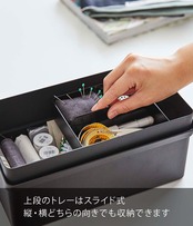 トレーは取り出すことができるので、卓上で道具類を散らかさずに裁縫できる