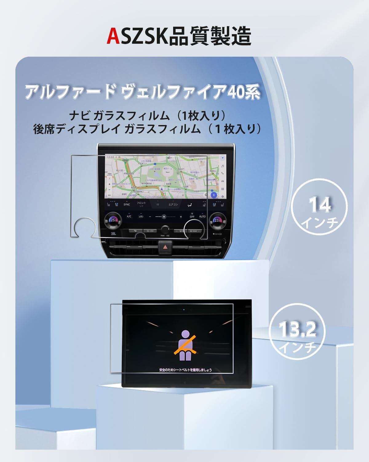 ASZSK 【2枚組:ナビ+後席モニター】カーナビ ガラスフィルム2023新型 トヨタ アルファード 40系 ヴェルファイア 40系 ナビフィルム 14インチ ナビゲーション用 13.2インチ 後席ディスプレイ 保護フィルム 9H硬度 指紋防止 傷防止 貼付簡単 高感度タッチ 液晶保護フィルム 新型ヴェルファイア 新型アルファード 内装 カスタム パーツ