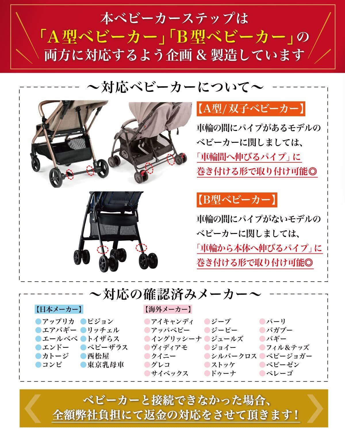 【全ベビーカーに対応】各メーカーから 二人乗り の 取り付け アダプタ として純正品の オプションボード として販売されている場合もありますが、補助ペダル がしっかりしていなかったり、サドル が付いていなかったりとバラバラな仕上がりになっています。Rozally ベビーカーステップ は、全モデル対応はもちろん、機能性もこだわりを持ってベビーカーステップの機能性に特化して製品化しました。 ※組み立ての前に付属の説明書を読んでください。