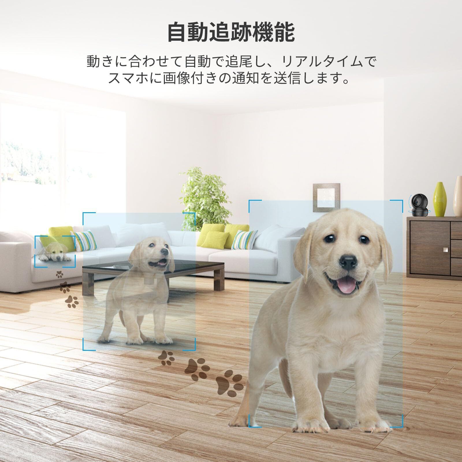 【ペットカメラ スマホ対応 & AI自動追跡】Android/スマホ対応アプリに対応し、動体検知で異常をリアルタイム通知。AIが動く対象を自動追尾し、部屋中のペットを見逃しません。