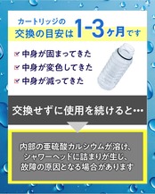 定期的な交換を 交換の目安は約1-3ヶ月ですが、使用頻度や水質によって異なる場合があります。水圧の低下や効果の減少を感じたら、交換時期の目安として参考にしてください。
