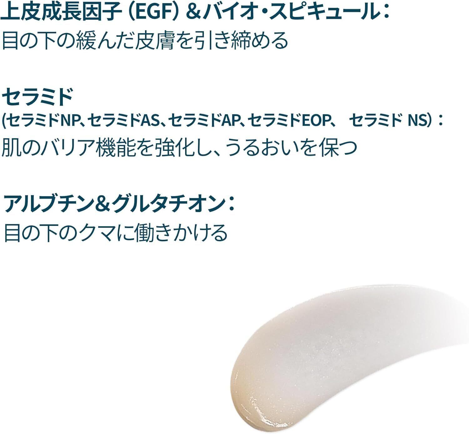 引き締め&リフテイアイフアレトアイバッッッククリ-ム EGF + バイオスビキユ-ル-目元の肌を集中的にケアし、みずみずしい印象をサポ-トします ナイアシンアミド-目元のト-ンを均一に整元、くすんだ肌を明るくすっきりとした印象を与えま寸 也ラミド-肌のバリア機能をサポ-トうるおいを保ちます