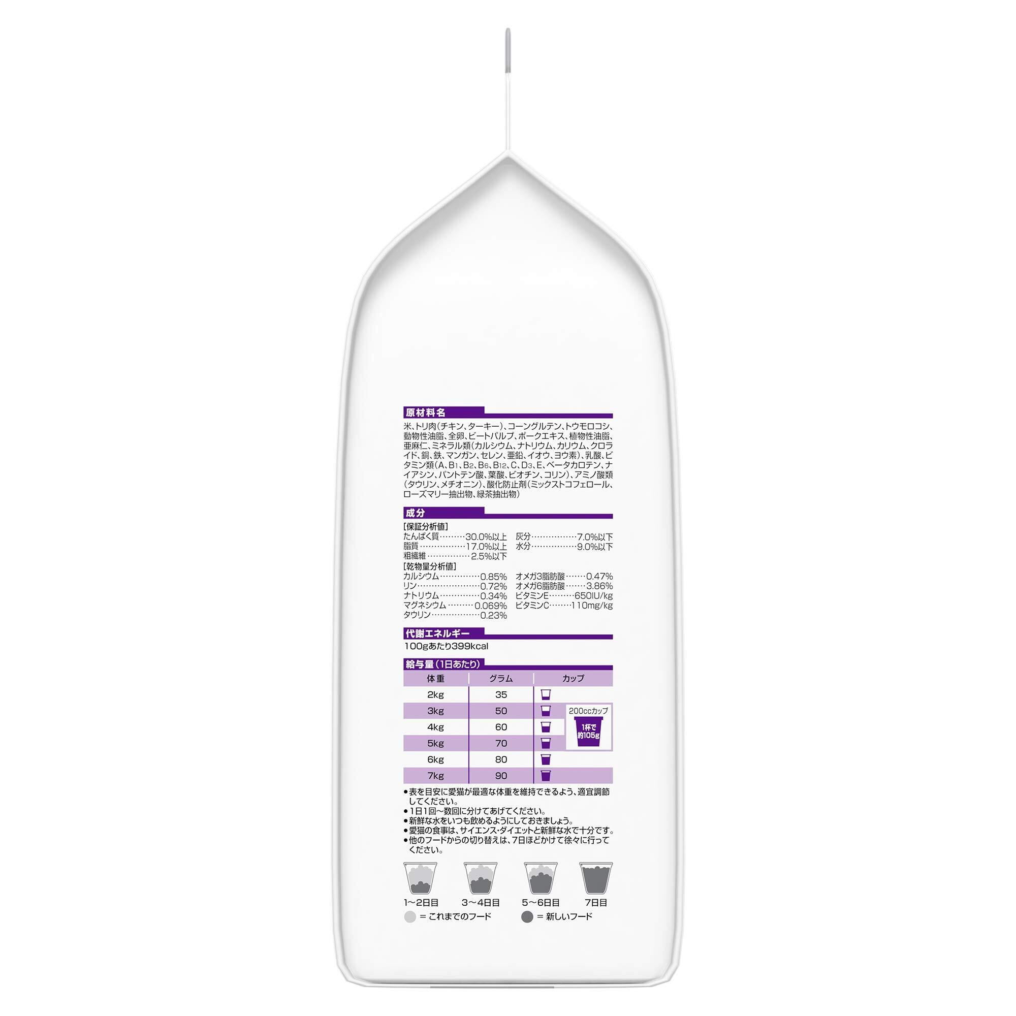 ビートパルプや亜麻仁などの可溶性繊維・不溶性繊維の組み合わせで良好な腸内環境と健康的な消化をサポート。ビタミンEと高レベルのオメガ-6脂肪酸(当社「アダルト チキン 成猫用」ドライ製品との比較して約16%増)が、健康な皮膚と美しい被毛をサポートします。ビタミンCとEを含む、科学的に証明された抗酸化成分によって本来の免疫力を維持。自然派成分で製品の酸化を防止し、着色料や合成香料は含まれていません。
