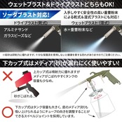 【基本性能を高めたサンドブラスター下カップ式】 製品は錆取りや塗装剥がし、下地処理、鋳物や陶磁器、ガラス類などへ装飾にも多様されています。 乾式の通常のドライブラストに加え、湿式のウェットブラストにも対応しており、対象部品を傷つけにくく、研磨性能が高い重曹粉末などを溶いたソーダブラストにも最適です。