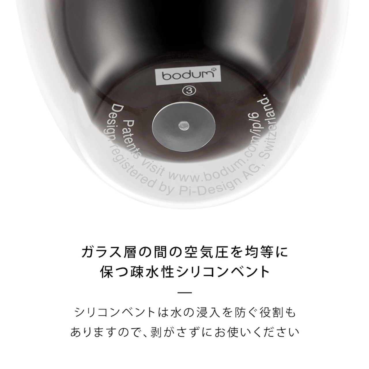 熟練された職人による吹きガラス製法で、ひとつずつ作られたボダムダブルウォールグラスは、耐熱ガラスの二重構造で、温かい飲みものは温かく、冷たい飲みものは冷たいまま、飲みもののおいしさを持続させる、保温性、保冷性に優れたグラスです。