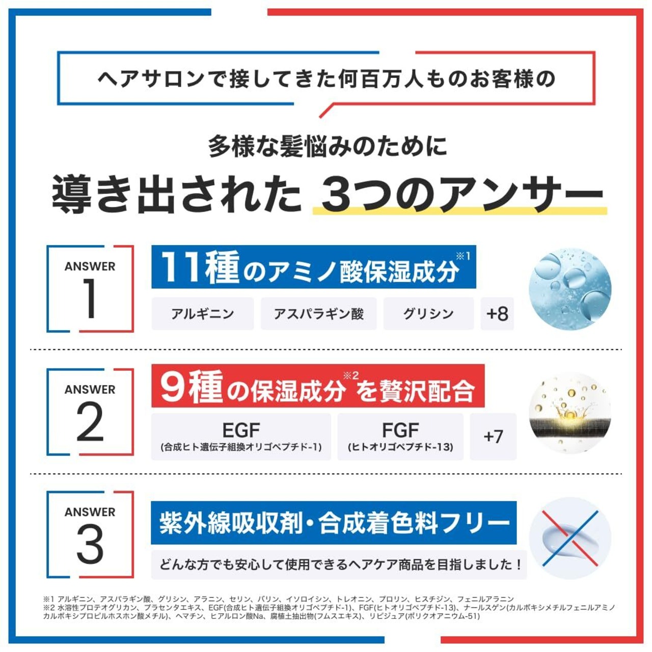【様々なダメージ補修成分配合】お客様の様々な悩みに合わせた、EGF・FGF配合(保湿成分)をはじめとする9種類のダメージ補修成分を配合しました。