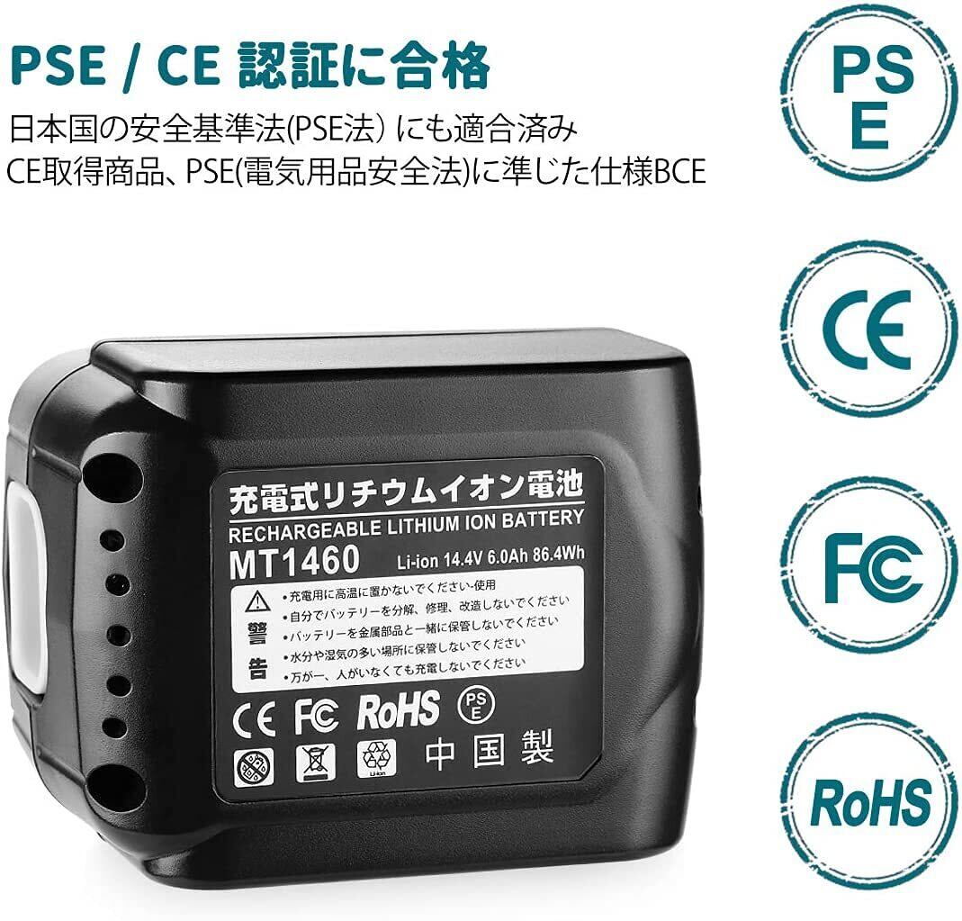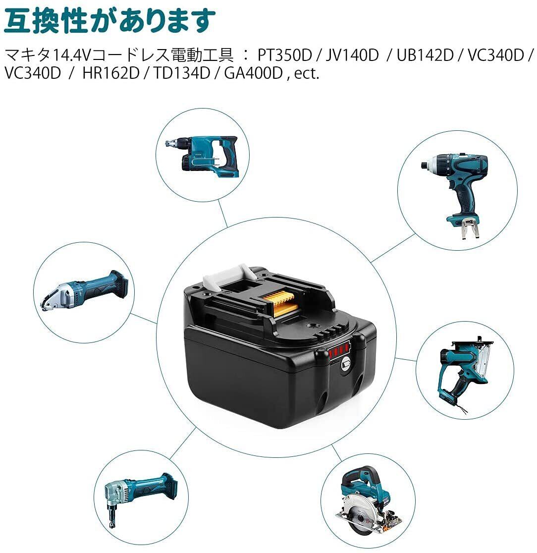 マキタ14.4Vバッテリー:BL1430B、BL1460B、BL1450、BL1460、194065-3、194066-1など完全対応。対応充電器:DC18RC、DC18RF、DC18RA、DC18RDなど。対応機種:PT350D、V140D 、UB142D 、VC340D、DA340D 、HR162D 、TW152D 、UC121D 、MUH351D 、TD135D 、FS440D、FR440D 、TP130D 、DF445D 、DF440D 、LC540D 、GA400D 、HP440D 、KS52 、TS130D 、TL060D 、CS540D 、VR340D、VR440D 、SS540D 、JS160D 、ST110D、ST420D、ST120Dなど。製品到着後、互換性がない場合は、お問い合わせください。ご注意ください: このマキタ 14.4V 交換用バッテリ製品の底部ステッカーにある番号は MT1460 です。