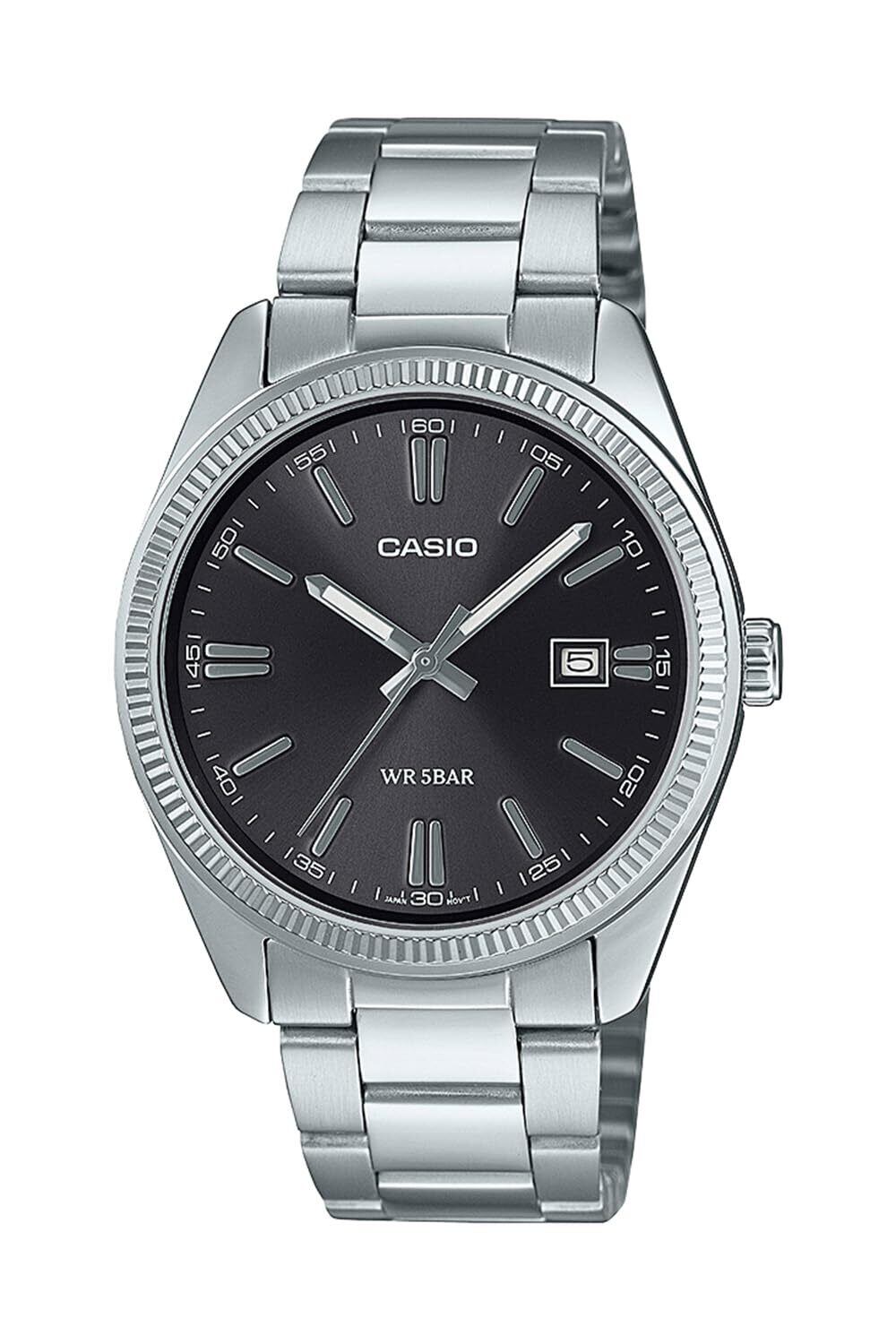 5気圧防水機能を備えた3針メタルアナログモデルです。 バーインデックスのシンプルなデザインで時刻も見やすく、3時位置の小窓では日付が確認できます。MTP-1302D-1A1JFは、文字板に旭光仕上げを採用しシックに仕上げています。