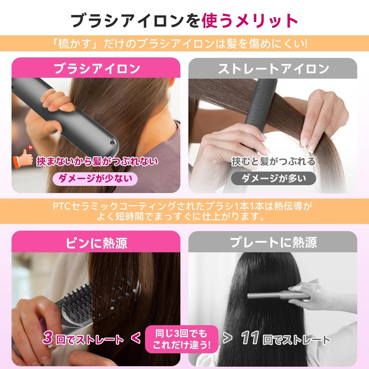 【時短スタイリング·ストレート&ワンカール兼用】高品質なPTCヒーターを採用し、さらに加熱ロジックを最適化することで、従来より約20%速く加熱できるようになりました。これにより、スタイリングにかかる時間を大幅に短縮できます。60秒急速ヒートアップできるので、2分間クイックスタイリングが実現します。ブラッシング感覚で時短にスタイリングできますので、初心者にもすぐに使いこなせます。細軟毛・ダメージ毛・硬毛等様々な髪質に合わせて三段階温度調節が可能です。ストレート&カール2way仕様のブラシアイロンなので、髪全体のスタイリングを1本で完結します。