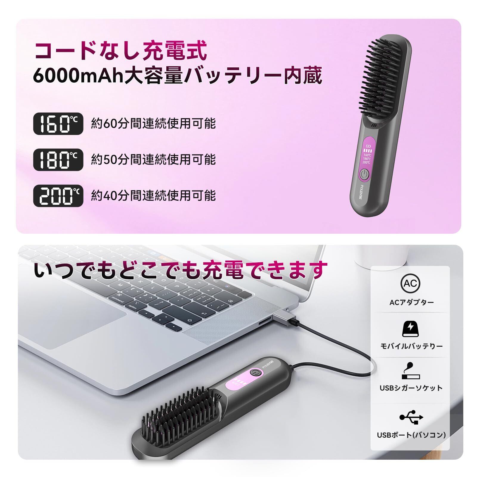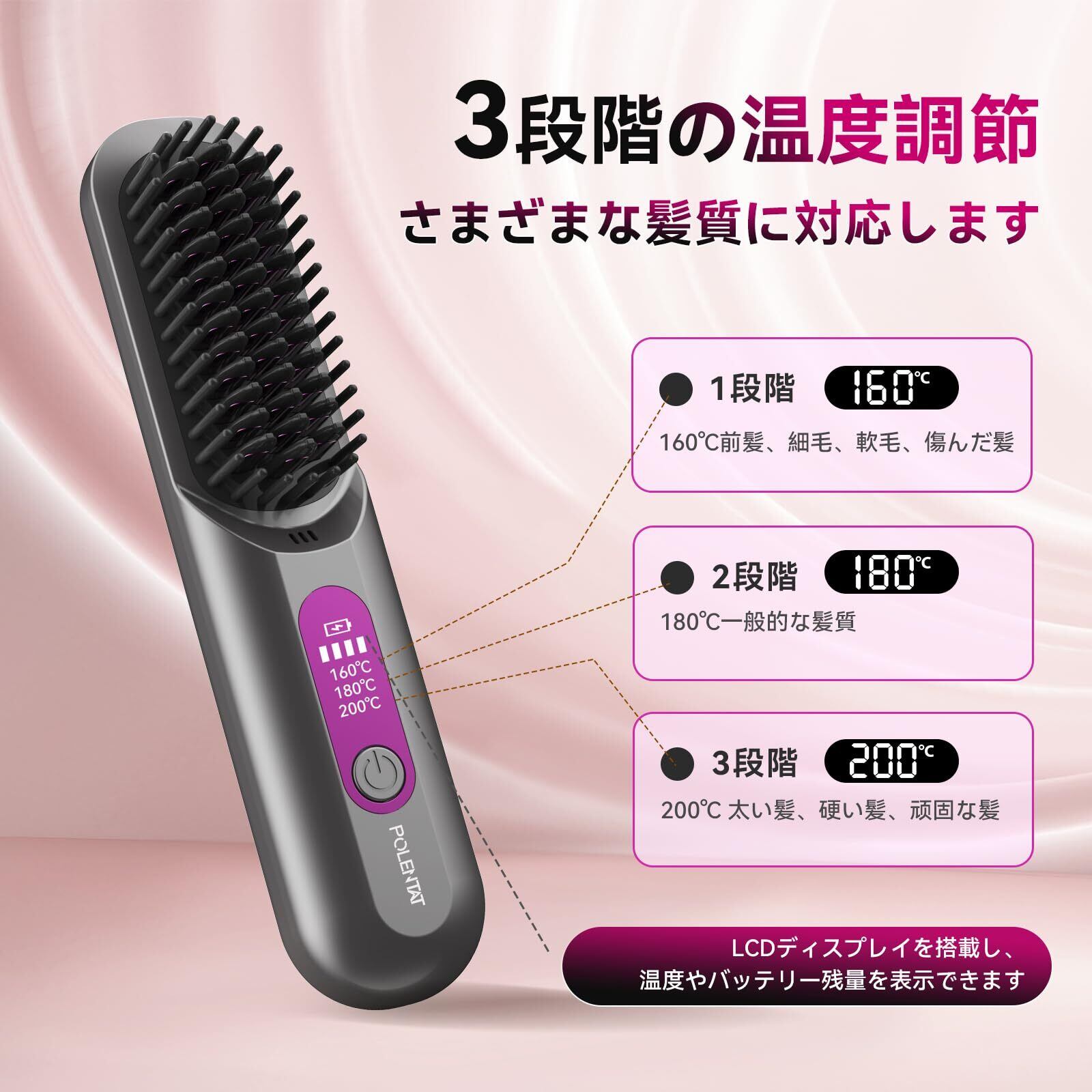 POLENTAT ヒートブラシ コードレス ブラシ型ヘアアイロン ストレートブラシ マイナスイオン 大容量6000mAhの改良モデル Type-C充電式 160~200℃ 3段階温度調整 セラミックコーティング 簡単ストレート 前髪 急速加熱 軽量 ツヤ 艶 傷まない ヘアケア