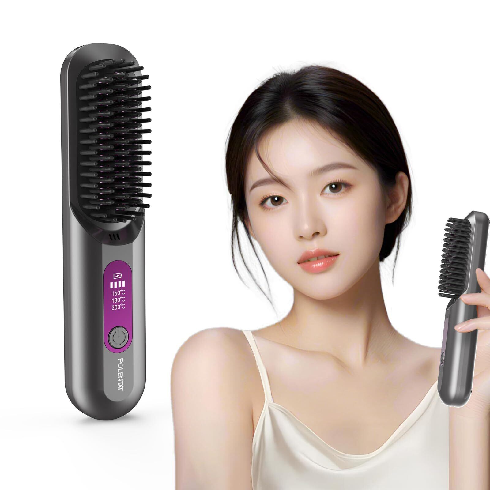【新着商品】POLENTAT ヒートブラシ コードレス ブラシ型ヘアアイロン ストレートブラシ マイナスイオン 大容量6000mAhの改良モデル Type-C充電式 160~200℃ 3段階温度調整 セラミックコーティング 簡単ストレート 前髪 急速加熱 軽量 ツヤ 艶 傷まない ヘアケア