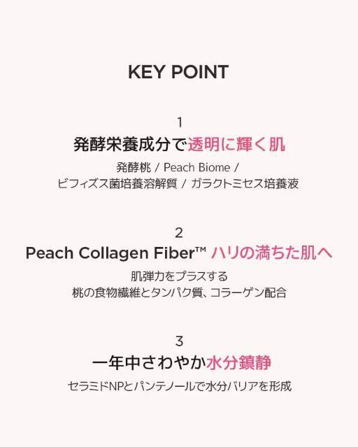 保湿とエネルギー(桃花エキス)、天然タンパク質成分(コラーゲン)、桃食物繊維(ペクチン)、肌の活力アップ(植物性タンパク質)