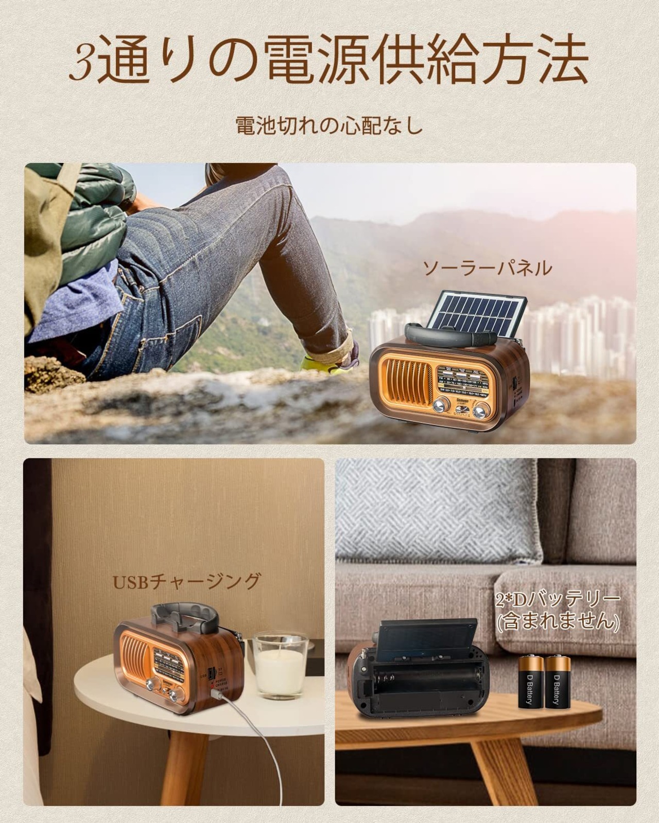 ご注意:このラジオはワイヤレスブルートゥースイヤホンに対応不可。【3通りの電源供給方法】 日常使いに便利なUSB充電、内蔵の1200mAh。2*Dバッテリーは、停電時や緊急時、アウトドアなどには欠かせません。充電効率の高い大型ソーラー パネル (10.4 x 5.8 x 0.3 cm) を搭載しているため、ハイキング、キャンプ、釣りの際に持続的に電力を収集します。付属のUSB充電ケーブルは背面のバッテリー収納部にありますので、取り出してお使いください。