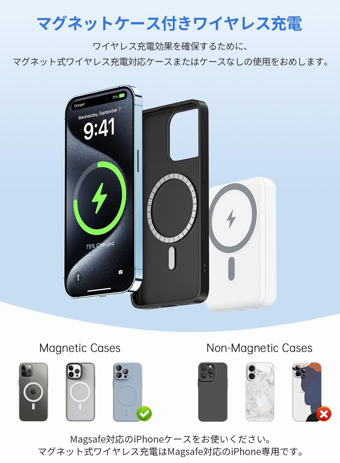 【2025年業界新登場!マグネット式ワイヤレス充電】強力な磁力により、簡単に装着して充電を開始できます。これまでのワイヤレス充電で懸念された、位置ズレによる充電不能の弱点を克服しました。カバンやポケットに入れたままでも、安定した充電が可能です。強力な磁力のおかげで、充電中にスマホが落ちる心配はありません。※本製品のワイヤレス充電機能は、ワイヤレス充電対応のスマートフォンなどのデバイスと、マグネット式ワイヤレス充電対応のケースにのみ対応しています。