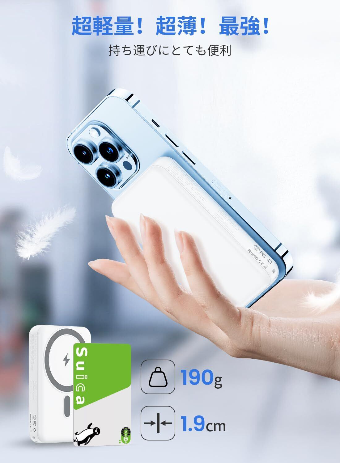 特徴 ワイヤレス充電・有線充電, 10000mAh大容量, 2台同時充電, カードサイズで携帯便利, PD20W Max急速充電