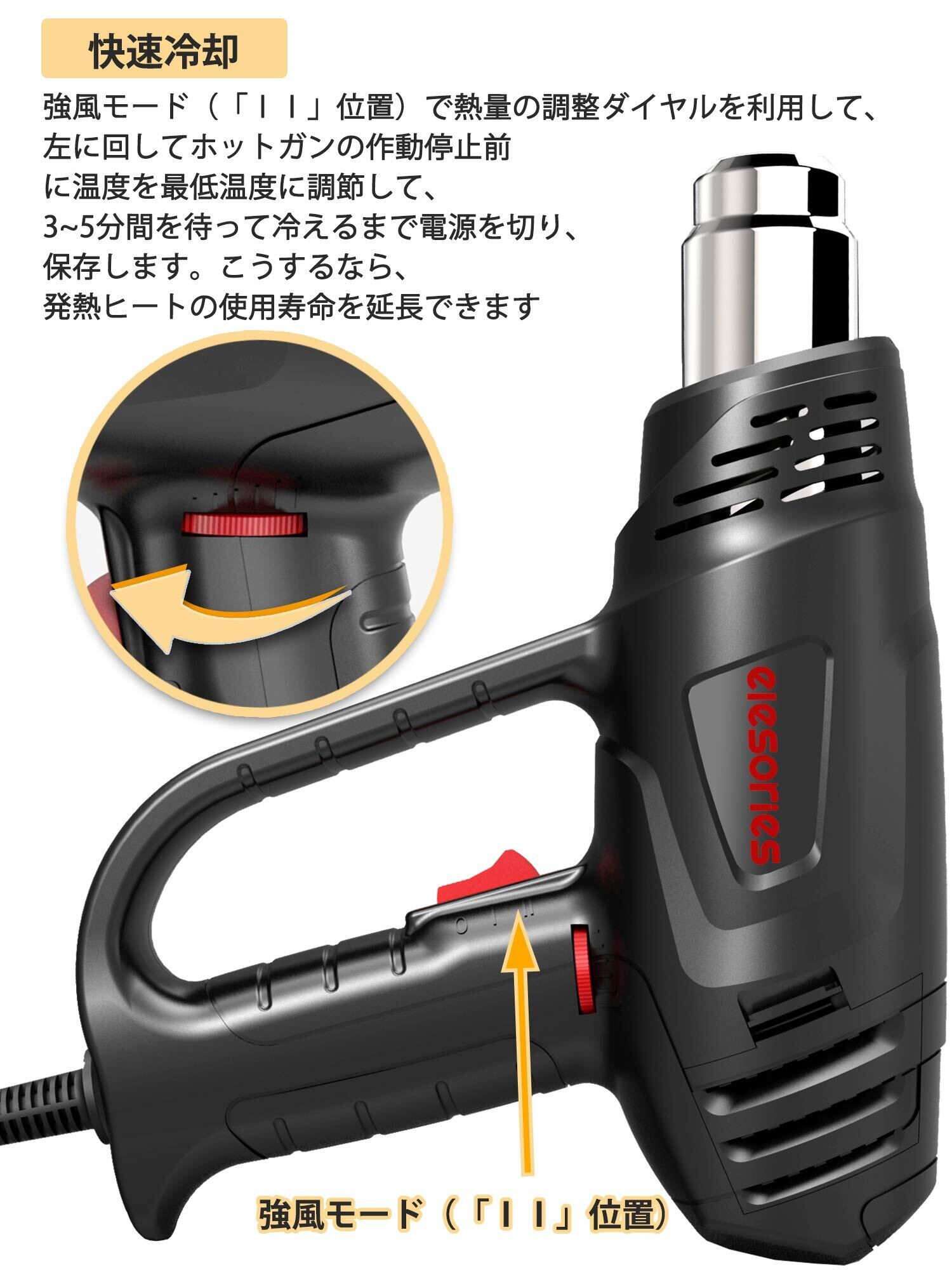 【快速冷却】強風モード(「II」位置)で熱量の調整ダイヤルを利用して、左に回してホットガンの作動停止前に温度を最低温度に調節して、3~5分間を待って冷えるまで電源を切り、保存します。こうするなら、発熱ヒートの使用寿命を延長できます