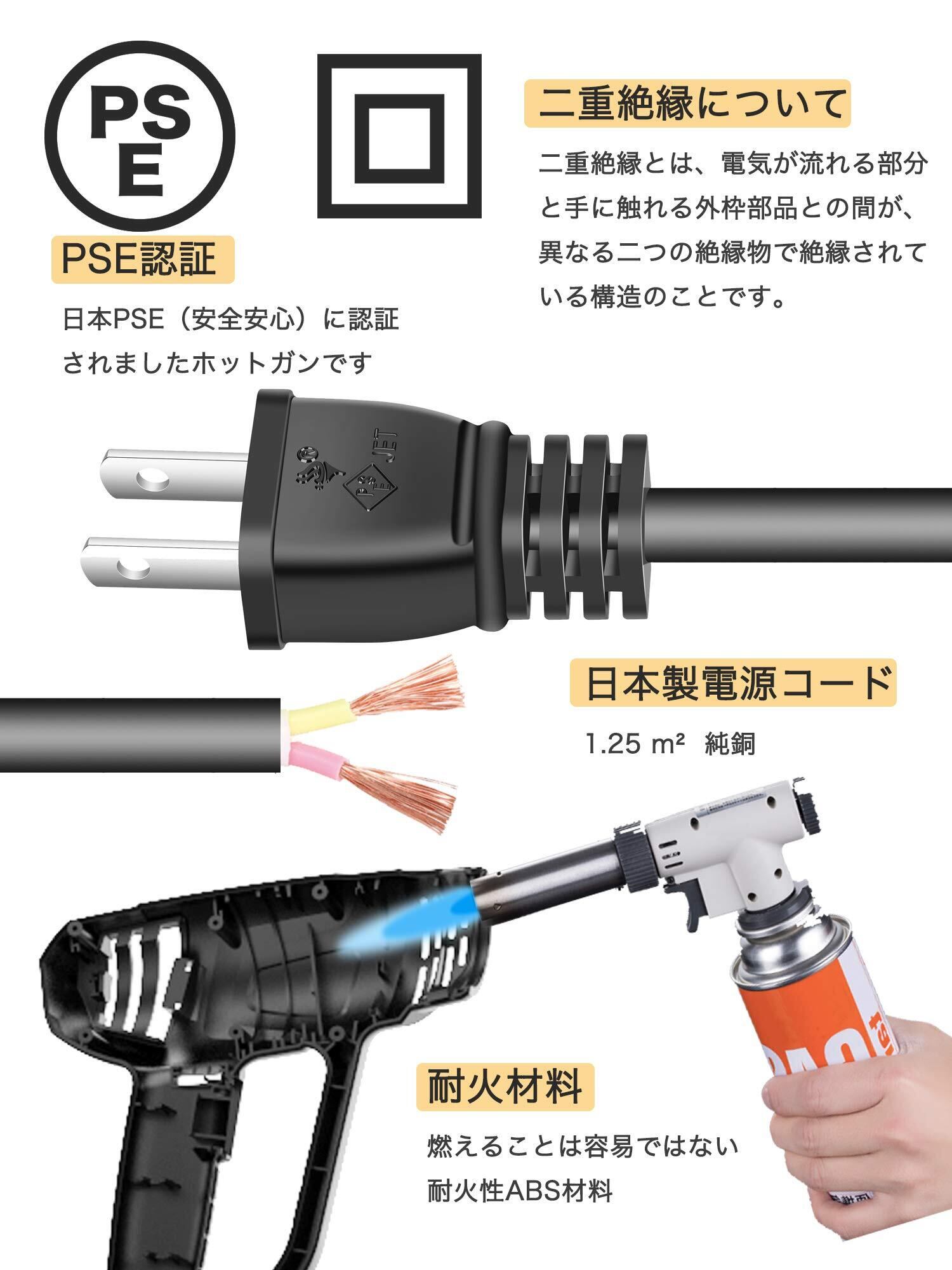 【日本規格に適合する】日本PSE(安全安心)に認証されましたホットガンです。入力: 100V 50/60Hz、消費電力:100~1200W(省エネ、環境にやさしい)ご注意:この製品は100 V電圧でしか使用できません。機械の内部が過熱すると、温度制御保護機構が作動します。機械が冷えるまで待ってから、通常通り使用してください。初めて使用する場合、少量の白い霧が発生することがありますが、ご安心ください、これは正常現象です。