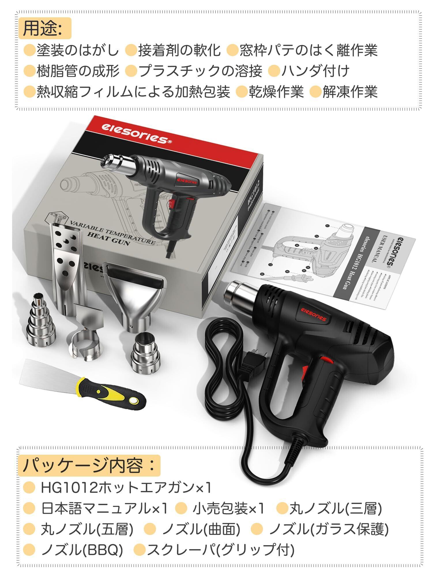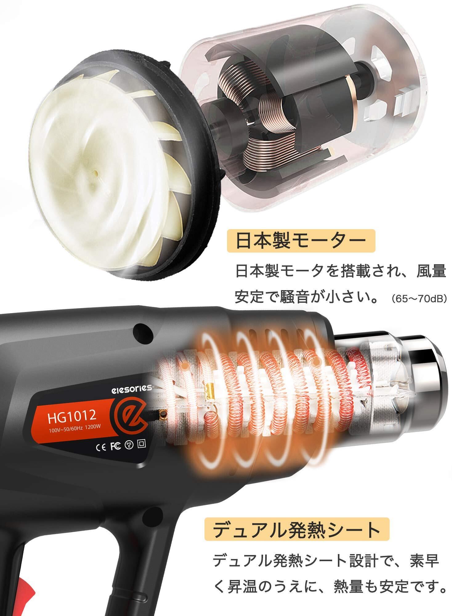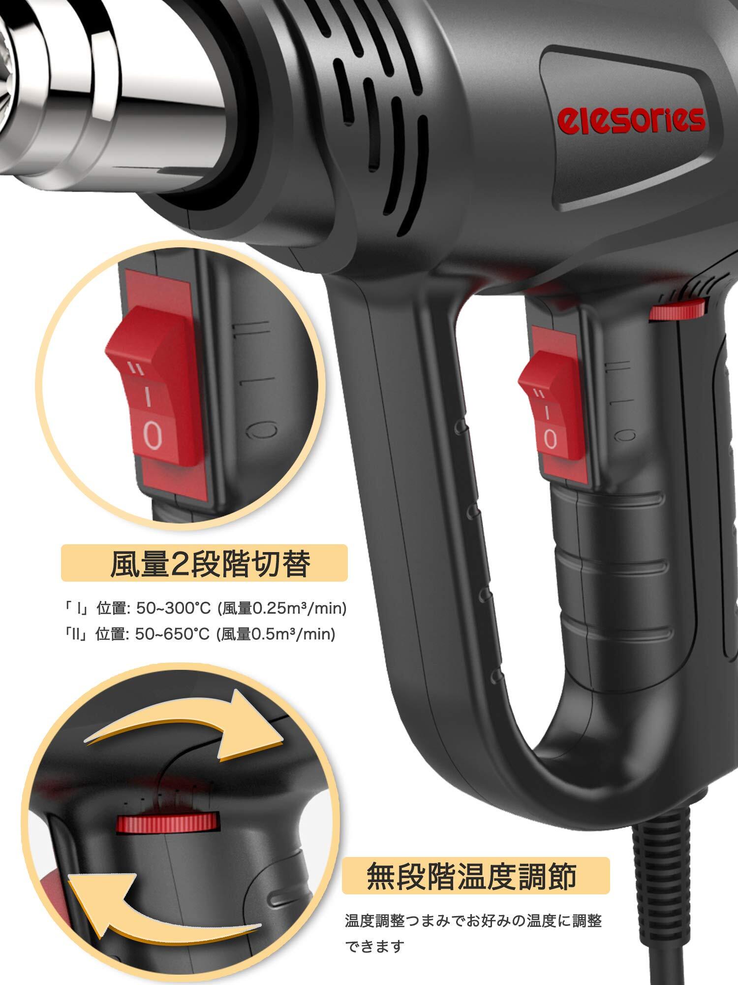 【2022最新】ヒートガン elesories HG1012 ホットガン ヒートエアガン 2段階風速 無段階調温可能 50~650度 多用途ホットガン ノズル5本付き 三角スクレーパー1本付き PSE認証 二重絶縁 (本体+付属品)