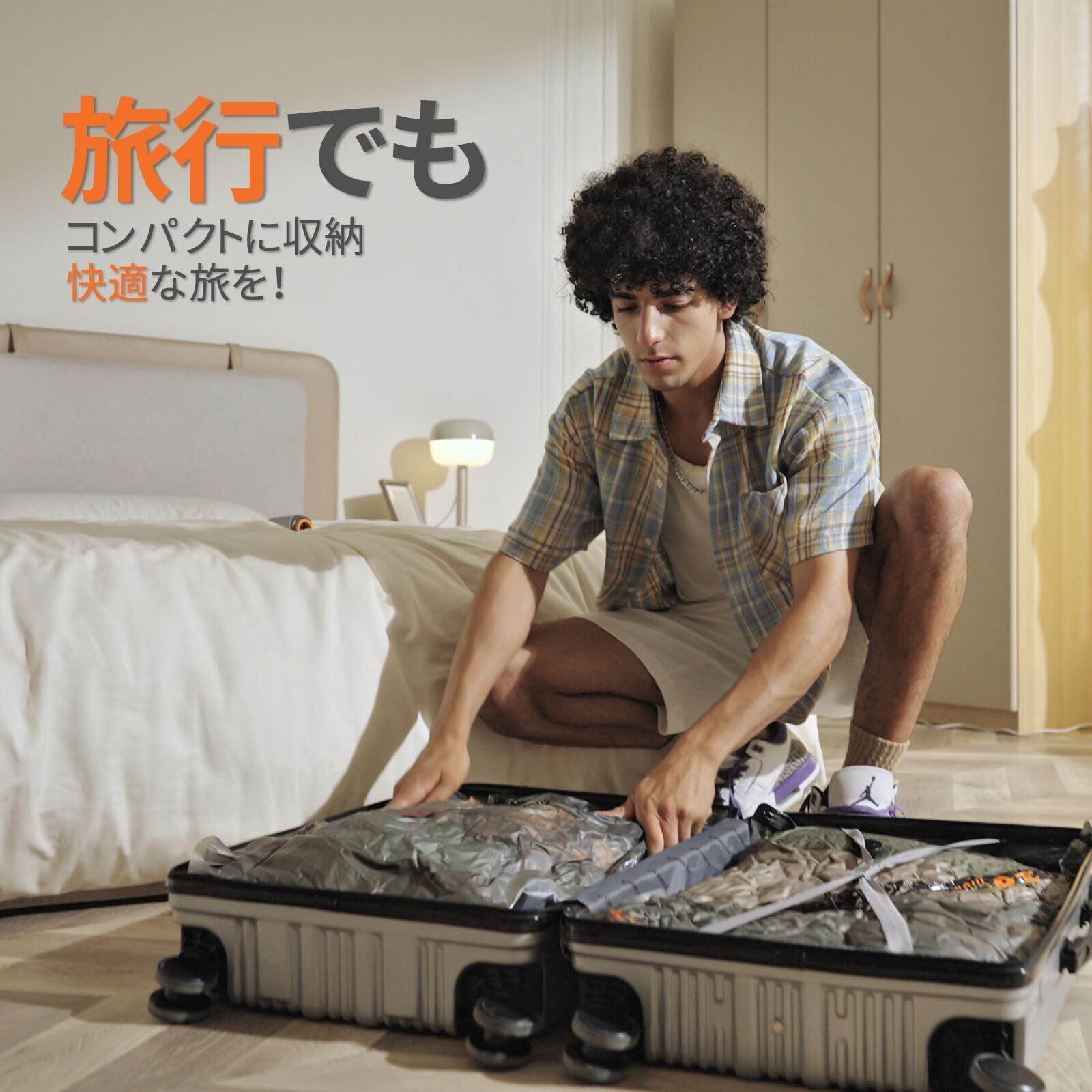 『最新開発の圧縮ポンプ』①USB充電式:Type-Cケーブル充電対応(注:5V/2Aアダプターで圧縮袋 吸引機を充電してくださいようお願いします)②アップグレード版仕様:1800mAhバッテリー、120L/minのポンプ速度、-4500Paの強力な吸引力で迅速に真空圧縮.超軽量125g.③ワンボタンでON/OFF:四つのLEDパワーインジケーターで充電状態を一目で確認可能.