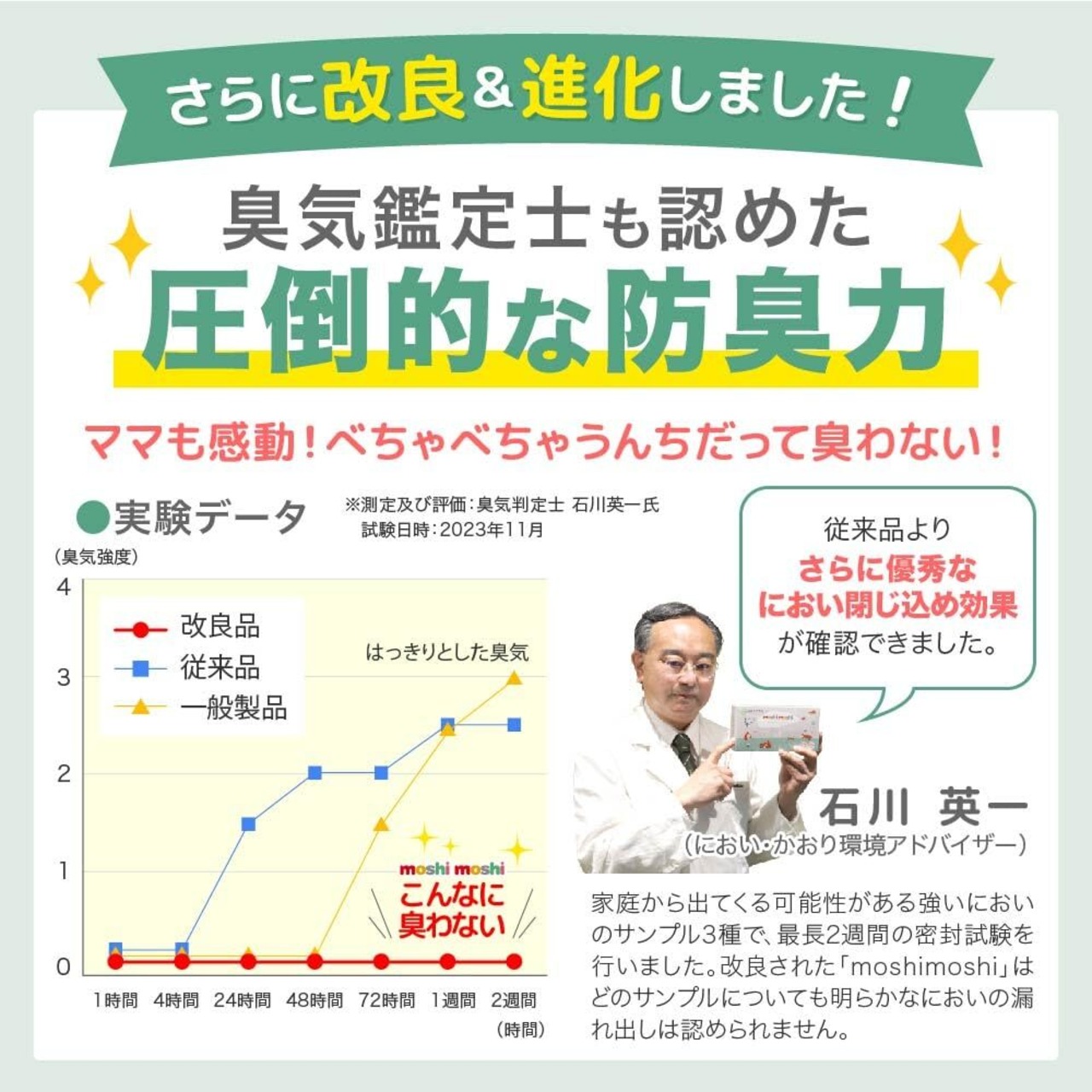 【臭い判定士のお墨付き】 国家資格「臭気判定士」を持ち、臭い探偵として臭い判定士のパイオニア・石川英一氏に判定していただきました!48時間以上臭い漏れしない、長時間の防臭力があるとの判定をいただいています。