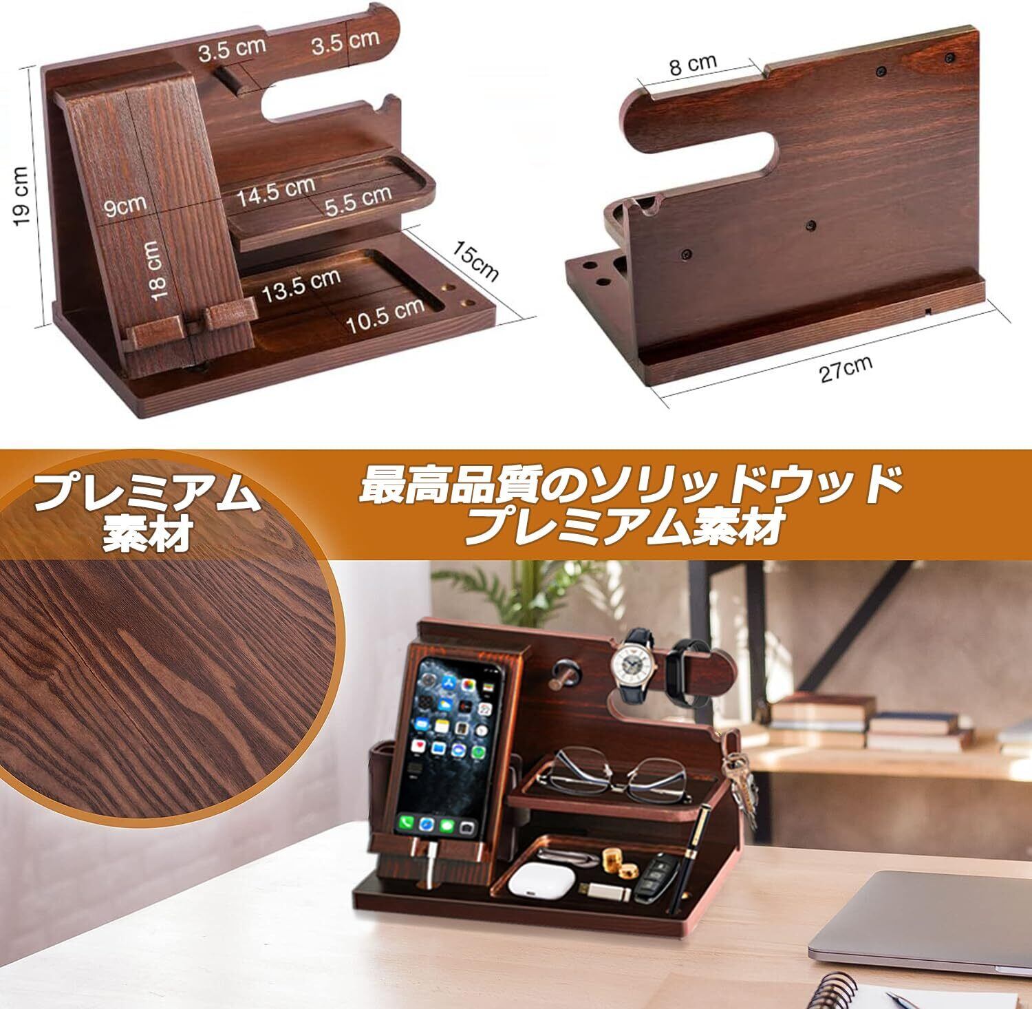 【もう散らからない】スタイリッシュな木製スタンドはガジェットにぴったりです。 財布、鍵、スマホ、時計、メガネなど、日常のすべてのアイテムを1つの場所に保管できる十分なスペースがあります。すべてが整っており、足りないものは何もない。