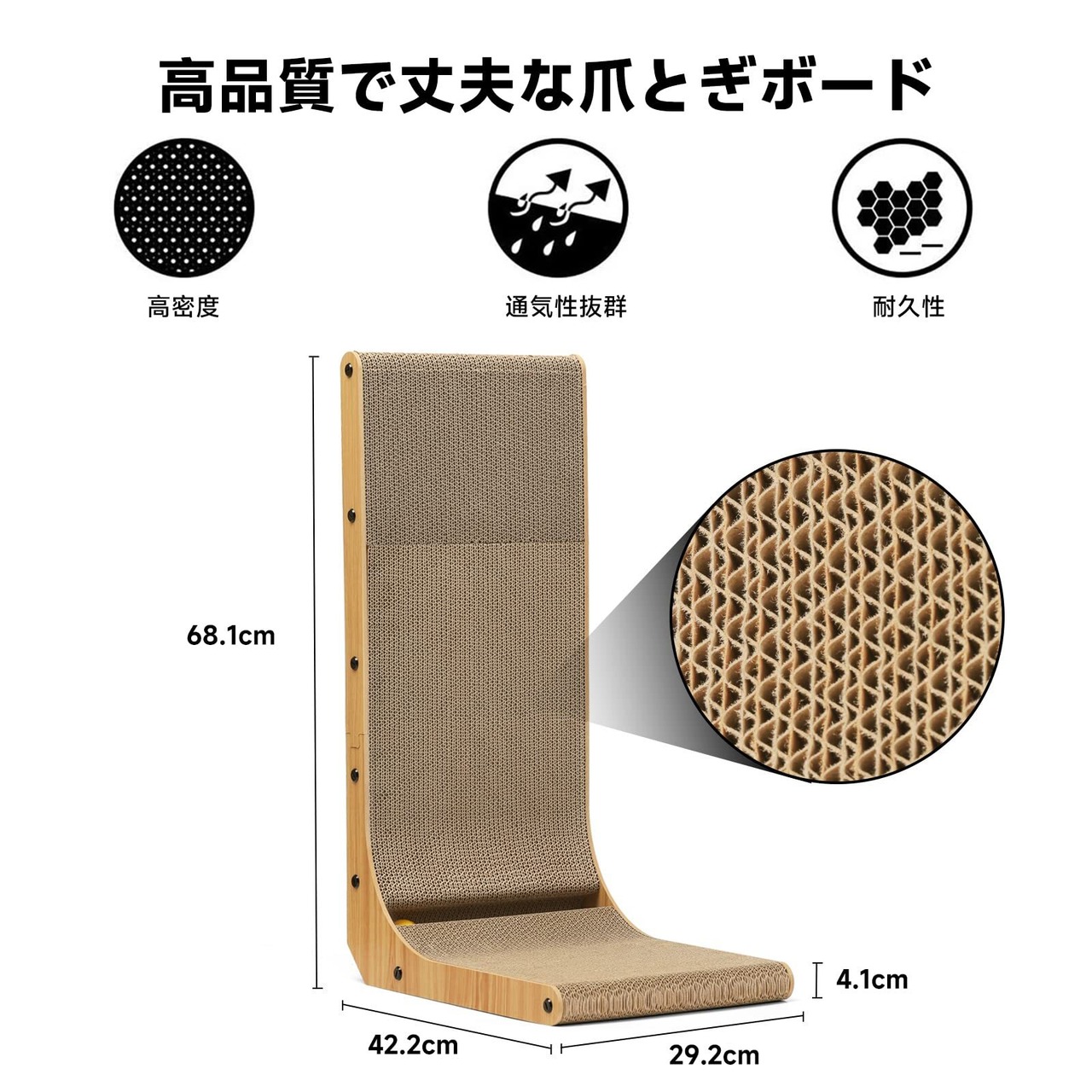 商品のサイズー42.2*29.2*68.1cm(縦*横*高さ)でL字型。また、段ボールの厚さは約4.1cmとなっております。