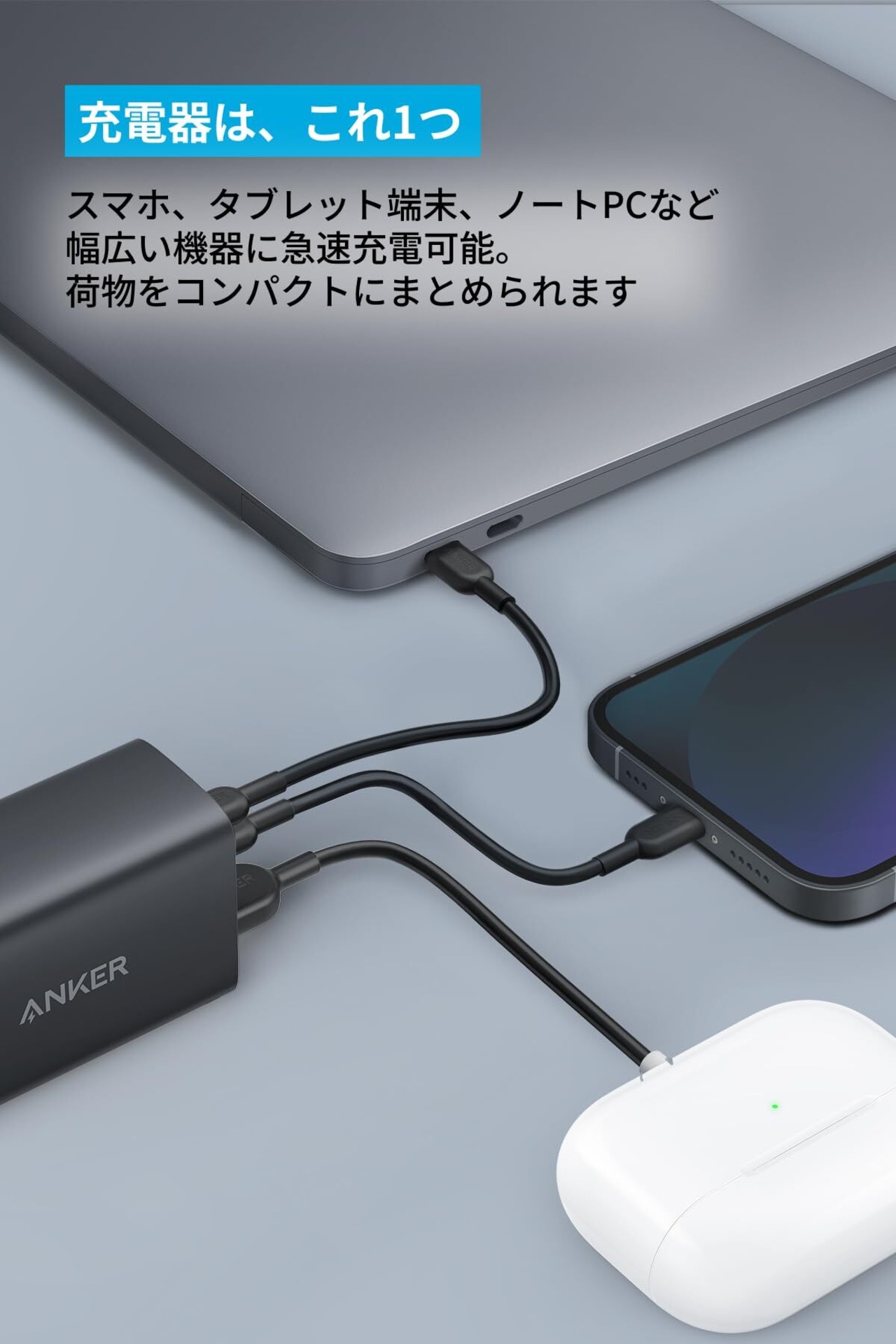 3台同時に充電可能:スマートフォン、タブレット、MacBook、USB PD対応のWindowsノートPCなど、多種多様なデバイスを一度に充電可能。PowerIQ 3.0 (Gen 2) を 搭載した2つのUSB-CポーとAnker独自技術PowerIQ搭載のUSB-Aポートを備えています。3ポート利用時の合計最大出力は65Wと高出力。機器毎に異なる充電器を持ち運ぶ必要はありません。※3ポート利用時の合計最大出力は64W