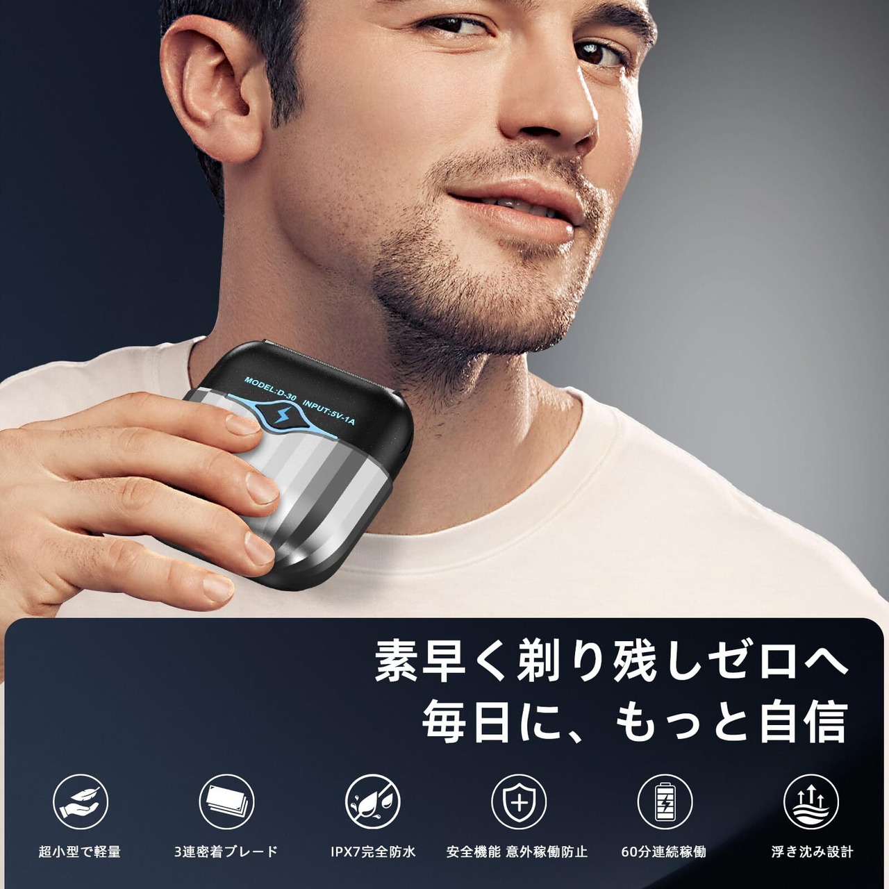 【強力なモーター・残りなし】急速モーターを搭載し、強いパワーで濃いひげでも長いひげでも簡単に剃れます、剃り残しがなし。使い方も簡単です、上にプッシュしてスイッチをオンできます、下にプッシュしてオフできます、初心者でもシンプルにつかえます。強力な性能の同時に、使用も簡単です。