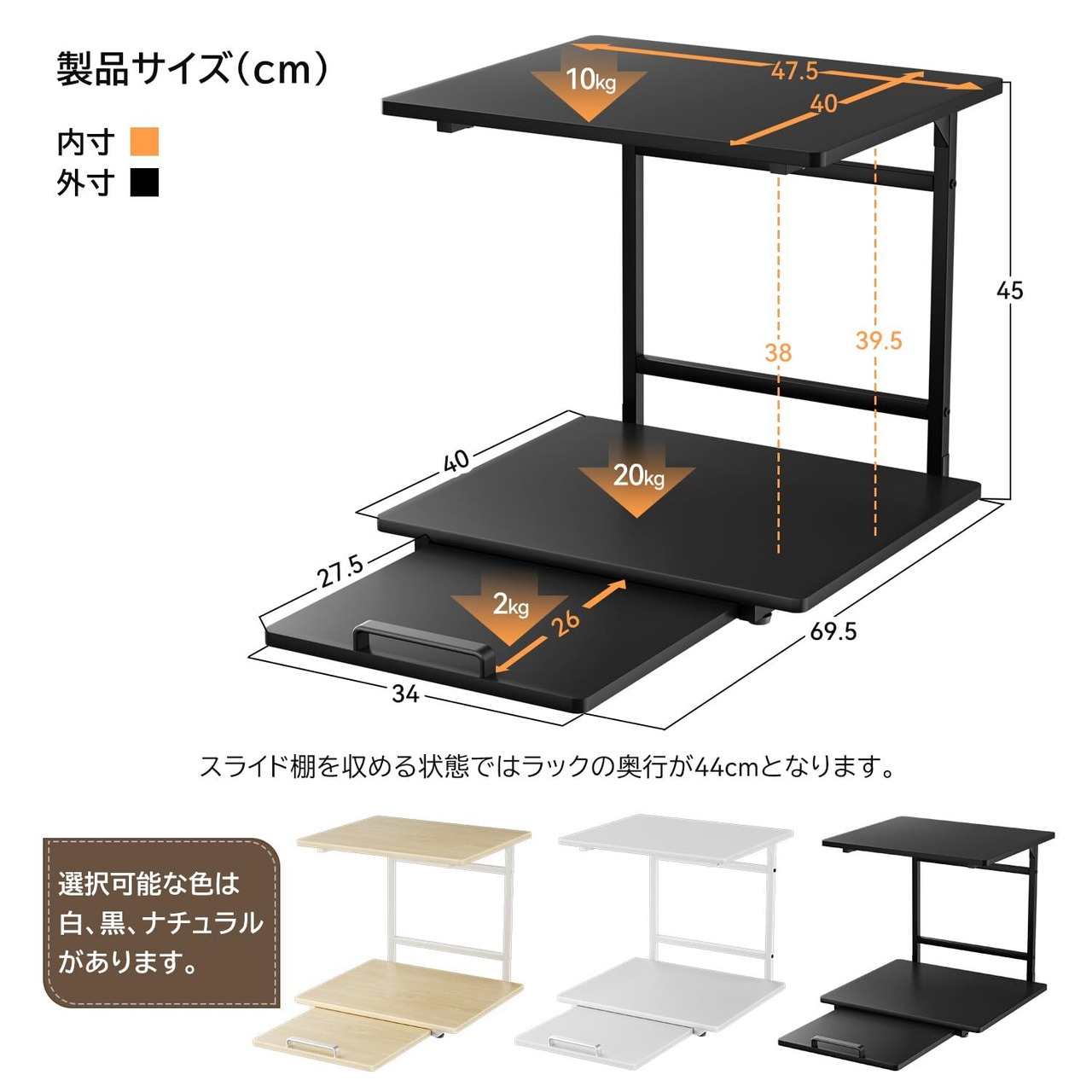【商品仕様】商品サイズ:幅47.5×奥行43.5-69.5×高さ45cm、棚板サイズ:幅47.5×奥行40cm。各層棚耐荷重:上段棚板:約10kg、下段棚板:約20kg、スライド棚板:約2kg。ラックの幅は47.5cmなので、市販のほとんどの小型冷蔵庫に対応できます。