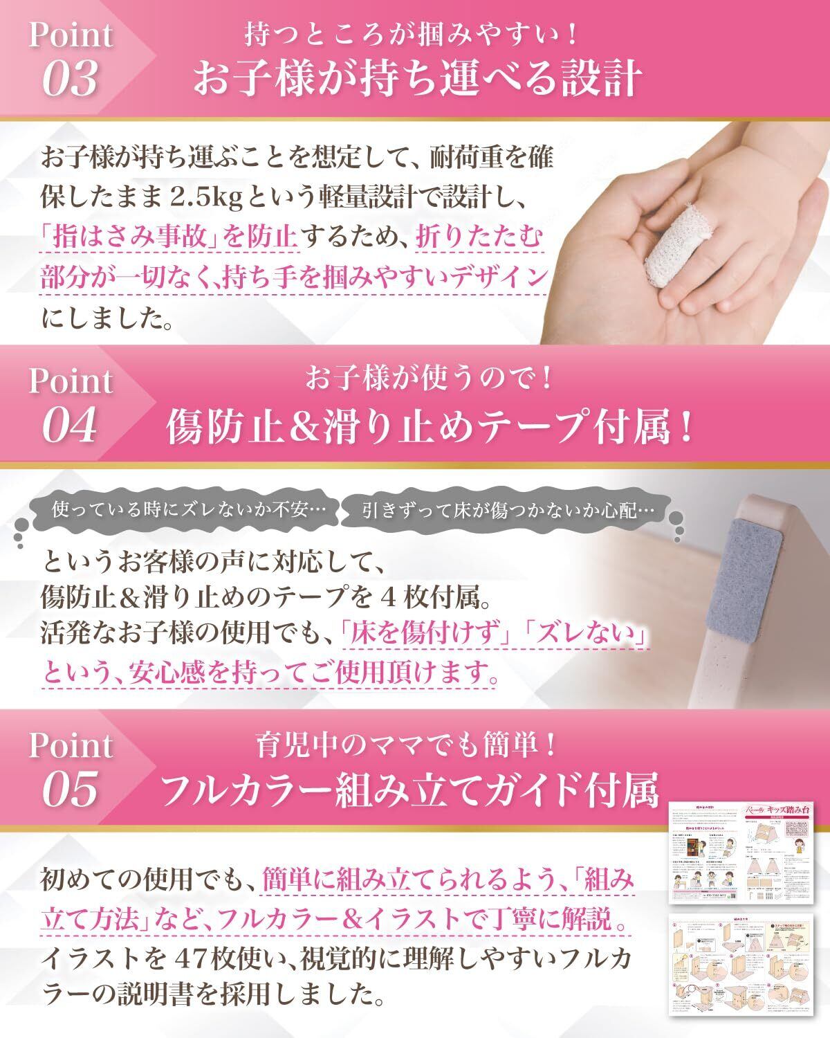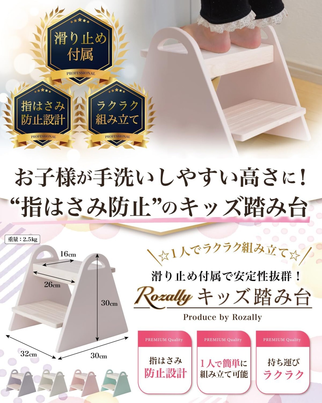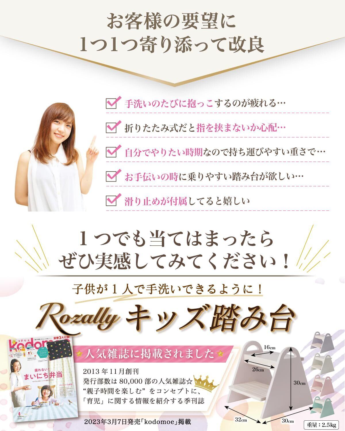 【こだわり】様々なメーカーから キッズステップ や キッズステップ台 として” 子供用 の 踏み台 ”が販売されていますが、Rozallyの キッズ 踏み台 は”こだわり”が一味違います。 トイレ の 踏み台 や 洗面所 の 踏み台 の関連製品 などメインに取り扱っている10社以上の工場からサンプルを取り寄せ、「指を挟まない×耐荷重100kgクリア」を一緒に試行錯誤して頂けた1社に絞って発注を行なっています。製品本体は「くすみカラー」を基調に「おしゃれ×かわいい」を意識して天然木で製造。男の子も女の子も気に入5色展開に致しました。