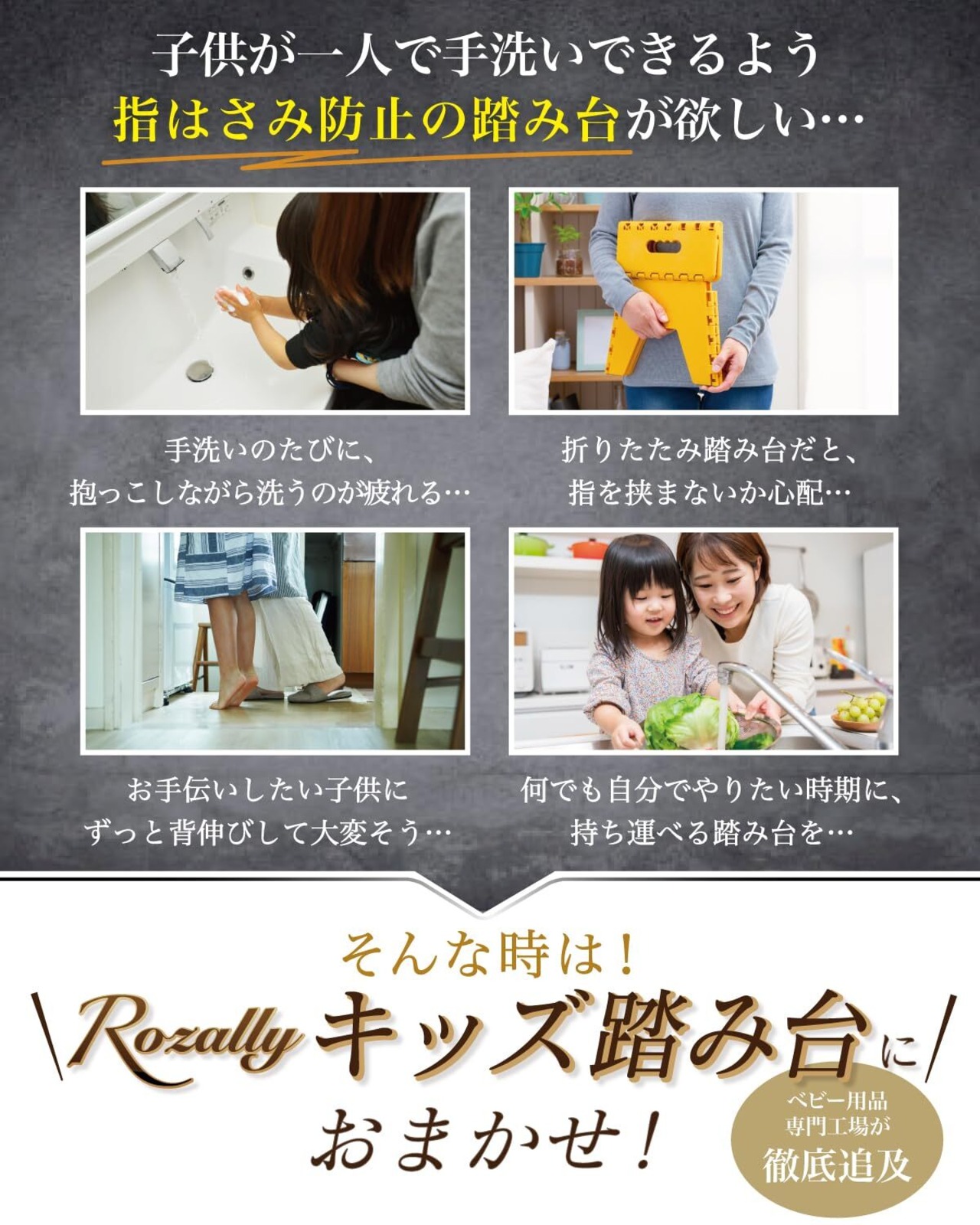 【保育士が監修】 Rozally キッズ 踏み台 がついに正式販売開始。 子供 の 手洗い の度に抱っこが疲れる…というお客様の声から生まれた 洗面所 や 台所 に 設置する 子供用 ステップ台 です。 キッズ踏み台 を使うことで、子ども が 手洗い や トイレ を1人でできるように 2段 ステップ でサポートができます。企画&設計では 幼児 の育児に詳しい【保育士】の先生からアドバイスをもらい、 指を挟まない 形状へと改良に加え、肌触り の良い「天然木」を 木製 素材を採用致しました。