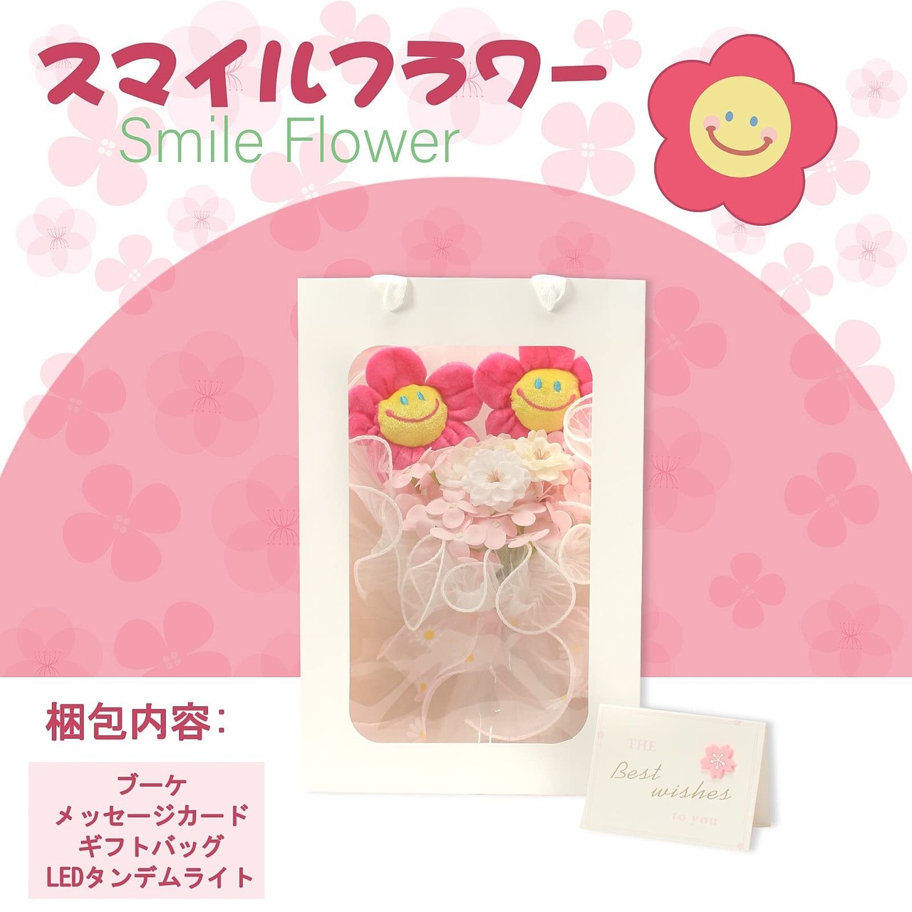 『仕様*梱包内容』29CM*25CM スマイルフラワー*2本、素材:毛玉。アジサイ*6本、桜の花*5本、素材:石鹸。ギフトバッグ、メッセージカード、LEDタンデムライト、専用運輸箱。