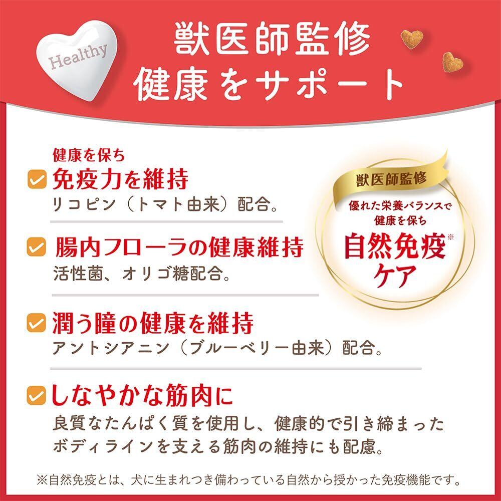 穀類(小麦ブラン、小麦粉、コーンフラワー、トウモロコシ、コーングルテンミール、ライスブラン)、肉類(チキンミール、チキンレバーパウダー)、油脂類(動物性油脂、植物性油脂(オメガ‐6脂肪酸含む)、共役リノール酸)、魚介類(フィッシュエキスパウダー、マリンコラーゲン、小魚粉末(DHA、EPA/オメガ‐3脂肪酸源))、ビール酵母(β‐グルカン源)、糖類(オリゴ糖、エリスリトール)、乳酸菌加熱菌体(エンテロコッカス・フェシウム(BIO)、ラクトバチルス・プランタラム(L-137))、カゼインホスホペプチド、果実類(クランベリーパウダー、ブルーベリーパウダー(アントシアニン源))、トマト(リコピン源)、L‐カルニチン、酵母細胞壁(食物繊維源)、ミネラル類(カルシウム、リン、カリウム、クロライド、鉄、銅、マンガン、グルコン酸亜鉛、硫酸亜鉛、ヨウ素、コバルト)、ビタミン類(A、B2、B6、B12、D、E、パントテン酸、コリン)、バチルスサブチルス(活性菌)、酸化防止剤(ミックストコフェロール、ローズマリー抽出物)、アミノ酸類(アルギニン、タウリン、メチオニン)、グルコサミン、コンドロイチン、ヒアルロン酸