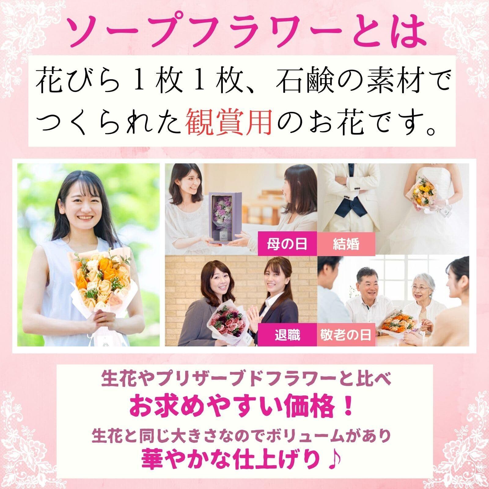 【特徴】ソープフラワーは花びら1枚1枚石鹸素材から作られた香り付きの観賞用のお花です。以前人気があったプリザーブドフラワーと比べて花弁が大きくボリュームが出ます。ふんわりと香るのでアーティフィシャルフラワーと比べても人気があります。 また生花のようにアレルギーの原因となる花粉や、細菌の繁殖がありません。 水やりなどの手間もなく置く場所に困りません。