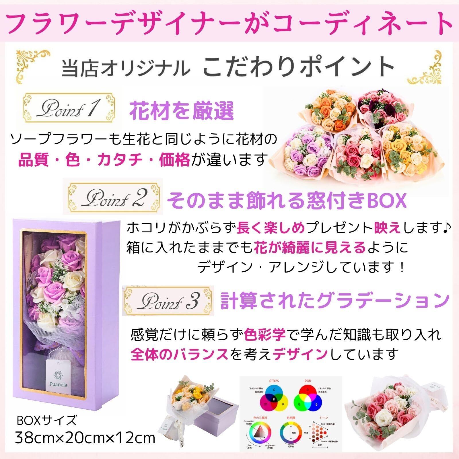 【フラワーデザイナー監修】(商標登録番号:6641739)生花・造花を含め花業界歴20年以上のデザイナーが累計7000人からいただいたお声をもとに細部にまでこだわった商品を販売させていただいております。受け取った方が幸せな気持ちになりますように・・・と願いを込めて作りました。※類似品にはご注意ください。