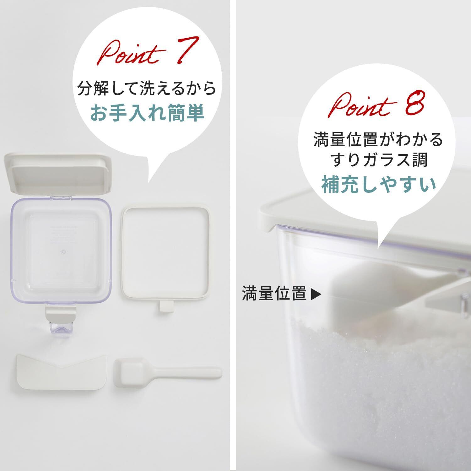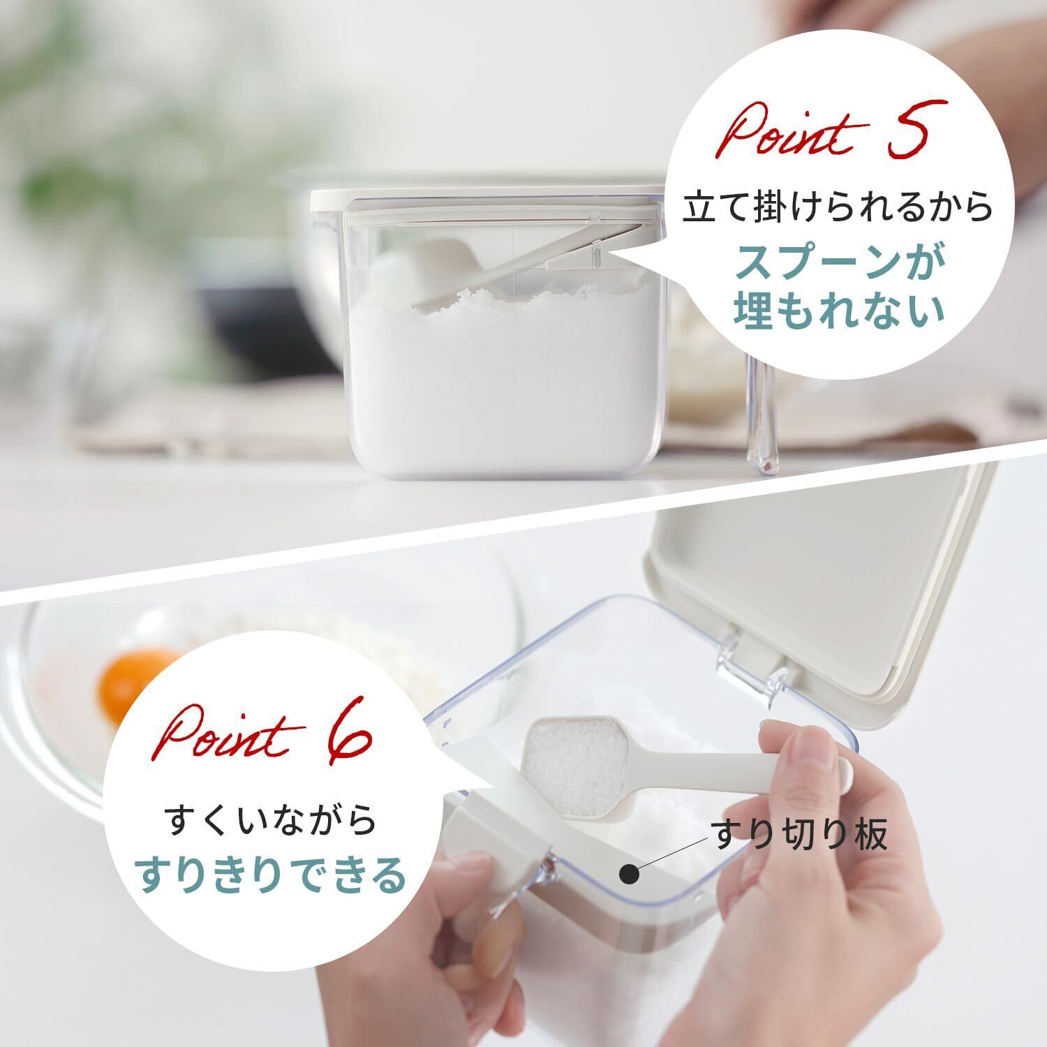 【便利な大さじスプーン付き】大さじ(15ml)スプーンと、すり切り板付きで簡単に計量ができます。すり切り板にスプーンを立て掛けられるので、スプーンが調味料に埋もれず衛生的。パッキンとすり切り板は分解して洗えます。※蓋は取り外し不可となっております。