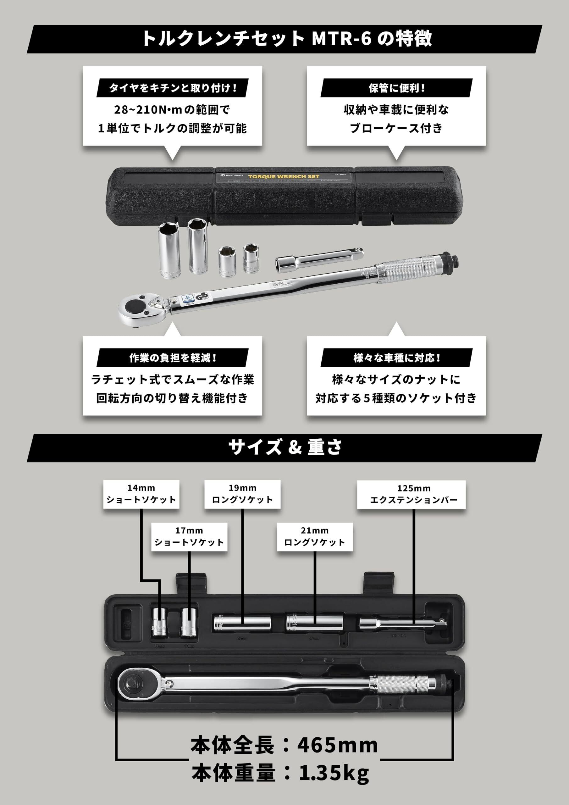 角利(KAKURI) トルクレンチセット 収納ケース付 トルク範囲28-210N.m ソケット14/17/19/21mm エクステンションバー125mm 差込角12.7mm ツール 工具 タイヤ交換 車 バイク 自転車 ラチェット式 マルチクラフト MTR-6