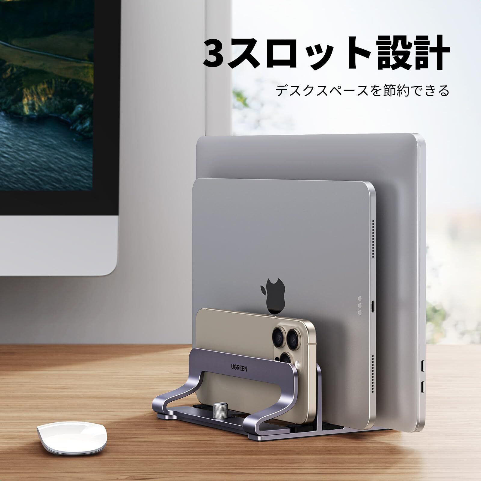 UGREEN ノートパソコンスタンド 縦型 3台収納 pcスタンド 縦置き 収納 3スロット 幅調整可能 アルミ合金製 シリコーンゴム傷防止 15.6インチまで対応 パソコンスタンド 全機種対応MacBook Pro Surface iPad HP Lenovo ThinkPad Huawei Surface Dell、HP、Lenovoなど