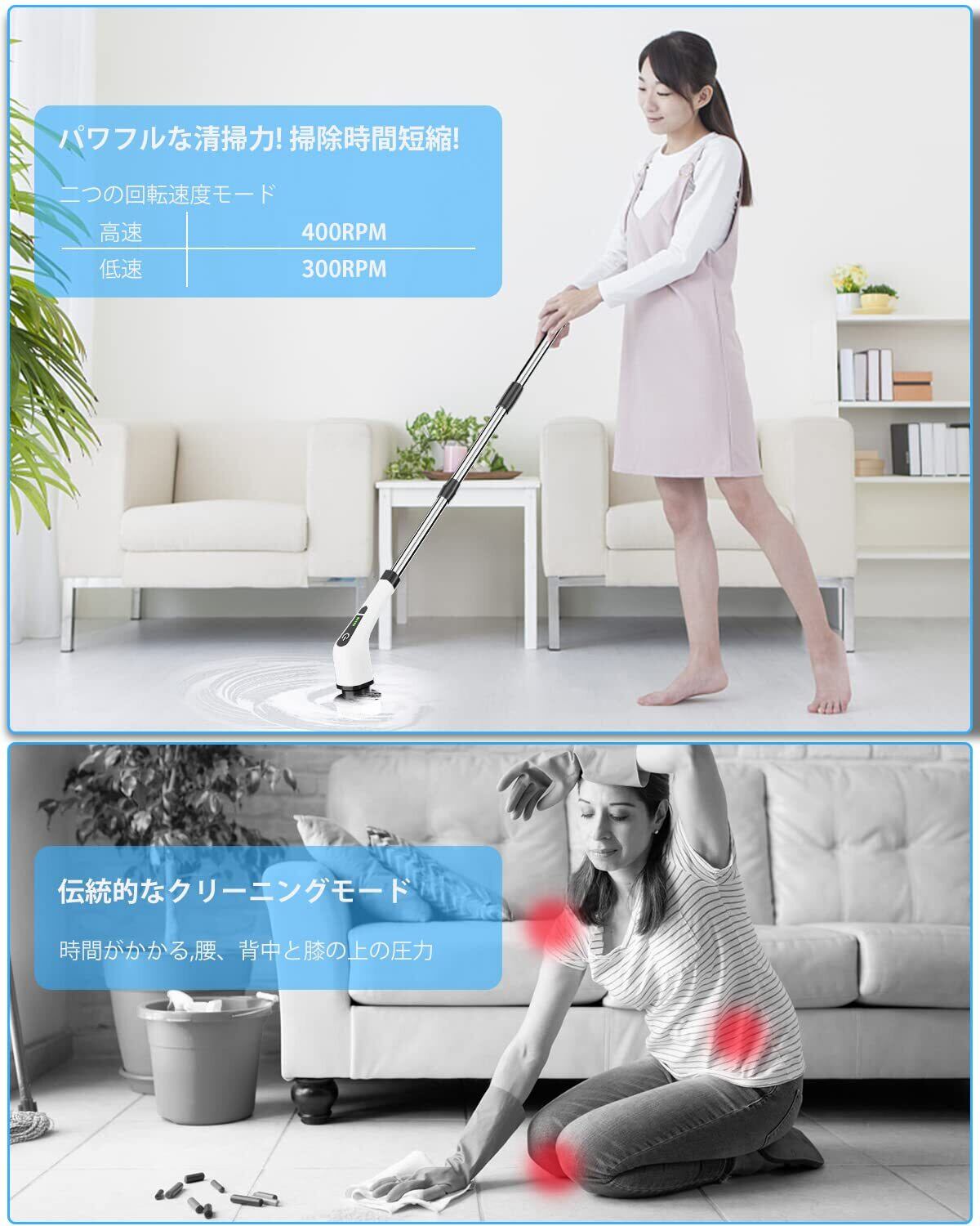 【 二つ回転モード&無線式】電動お掃除ブラシは400RPMと300RPMという2段階の回転速度を搭載し。電源ボタンをオンにして、ボタンを短く押してモードを切り替えます。フロアバスルームクリーナーを使用してください 頑固な汚れでも簡単に取り除き、掃除時間も短縮し、時間を節約できま。そして、電動お掃除ブラシはコードレスの設計で、電線に邪魔せず、どこでも自由に掃除できます。(ご注意:充電中、使用できません)