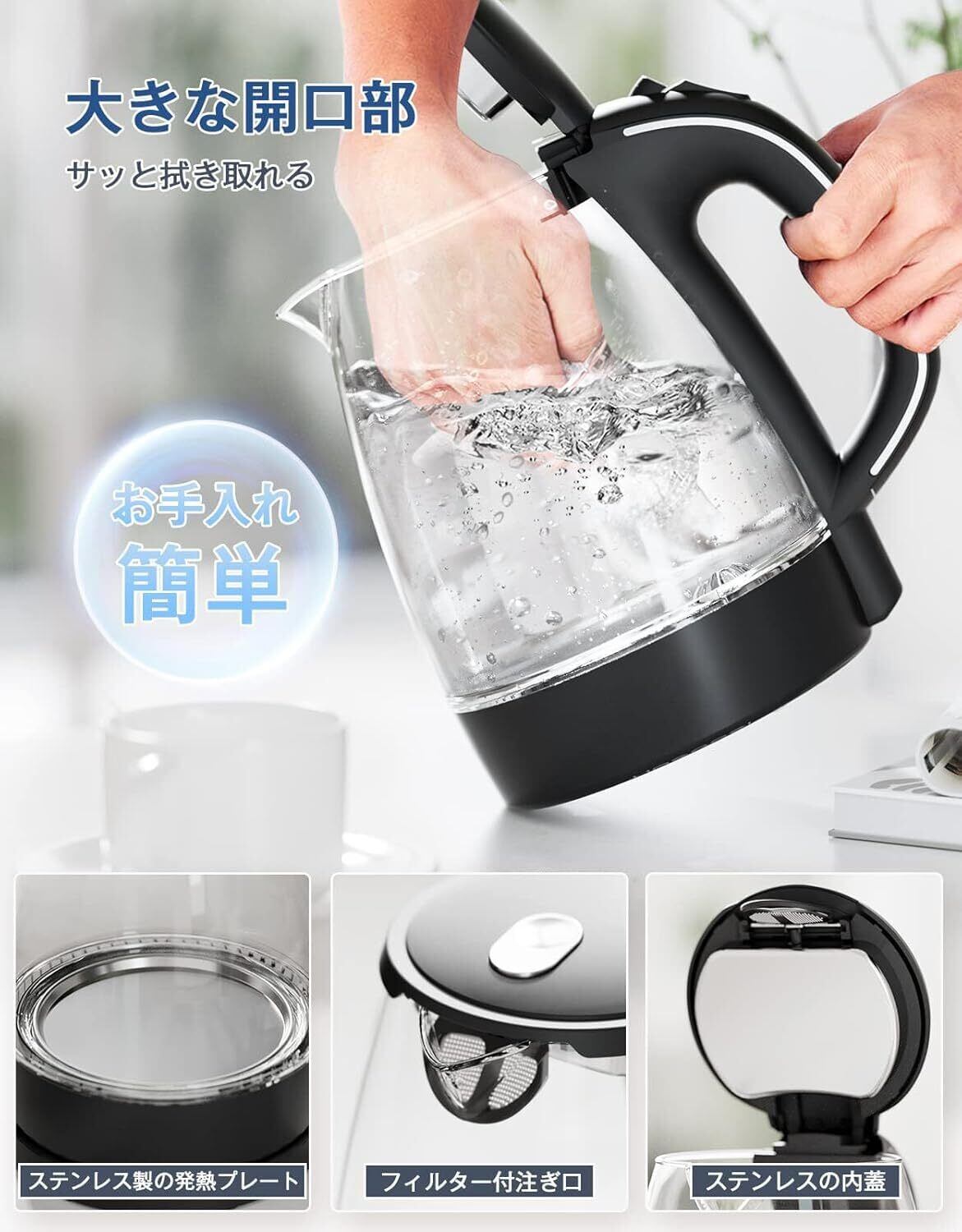 特徴 無臭&有害物質なし, 沸騰自動OFF/空焚き防止機能, LED付き, 目に見える水垢&掃除簡単