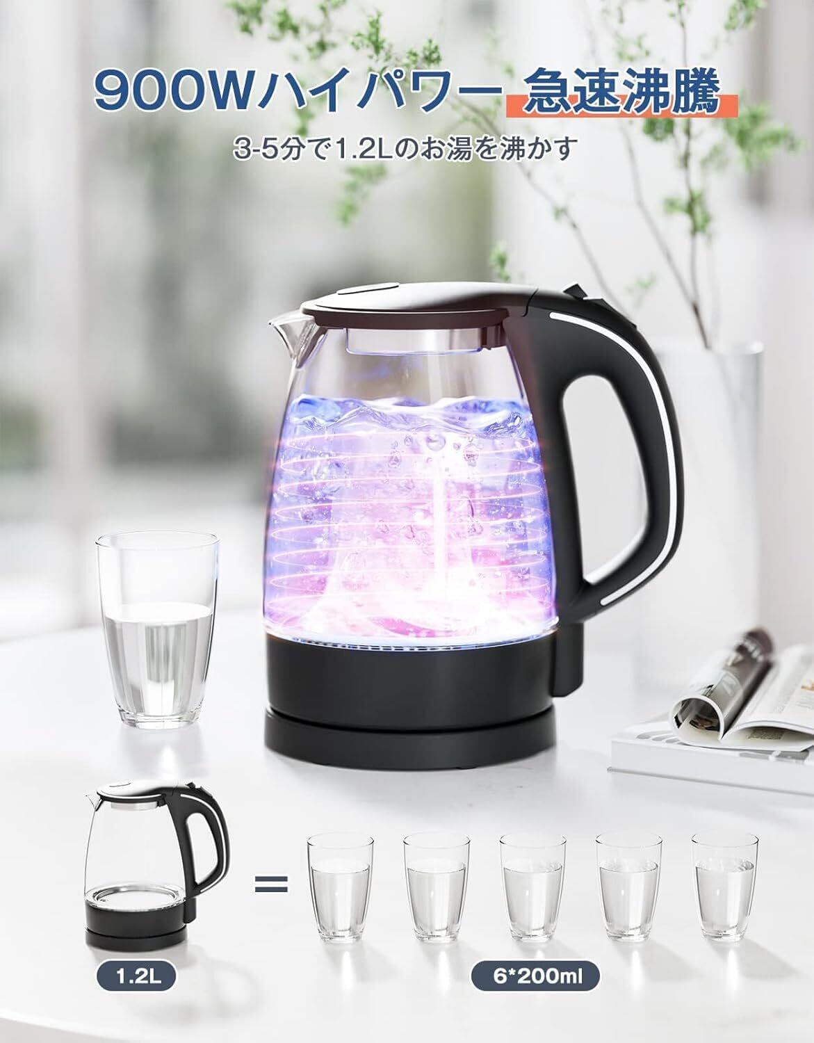 【2025新登場】ハゴオギ (HAGOOGI) 電気ケトル 耐熱ガラス 1.2L ケトル 電気 ガラスケトル LEDライト付き【無害•無臭】透明 おしゃれ 湯沸かし 電気ポット お手入れ簡単 沸騰自動OFF/空焚き防止機能 PSE認証済み コーヒー 紅茶 お茶 ブラック
