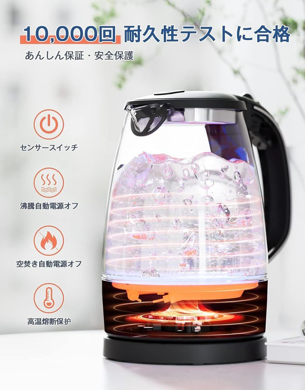 ✨【多層安全機能 安全性アップ】ハゴオギのガラス電気ケトルに高品質で高精度の温度センサーが温度制御を正確にコントロールができ、安全性を守るための自動電源OFF&空焚き防止機能がつき、沸騰完了時または水を入れ忘れた時に役を立ち、火災や感電事故を防ぐことができます。さらに、10,000回の耐用テストに合格、最大5年間の耐用年数で優れた耐久性を持つケトルです