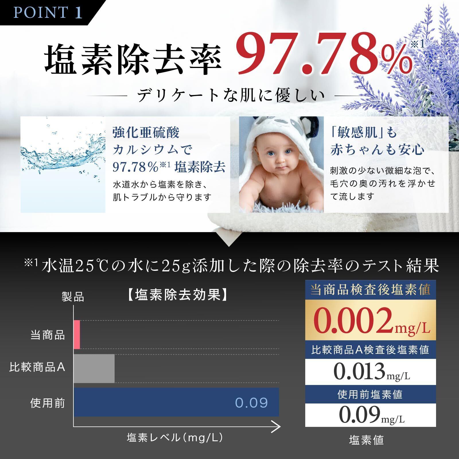 繊維フィルターで汚れを除去し、亜硫酸カルシウムで塩素を低減します。 亜硫酸カルシウムはより効率よく塩素を除去する為により性能が強化されたものを使用しています。(弊社従来品比)
