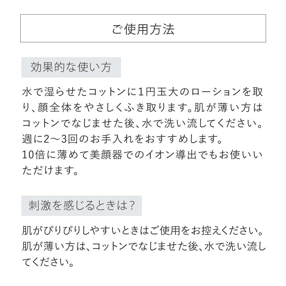 【ご使用方法】コットンに1円玉大のローションを取り、顔全体をやさしくふき取ります。週に2~3回のお手入れをおすすめします。10倍に薄めて美顔器でのイオン導出でもお使いいただけます。肌が薄い方・敏感な方は、水で湿らせたコットンでなじませた後、水で洗い流してください。肌がぴりぴりしやすいときは、ご使用をお控えください。