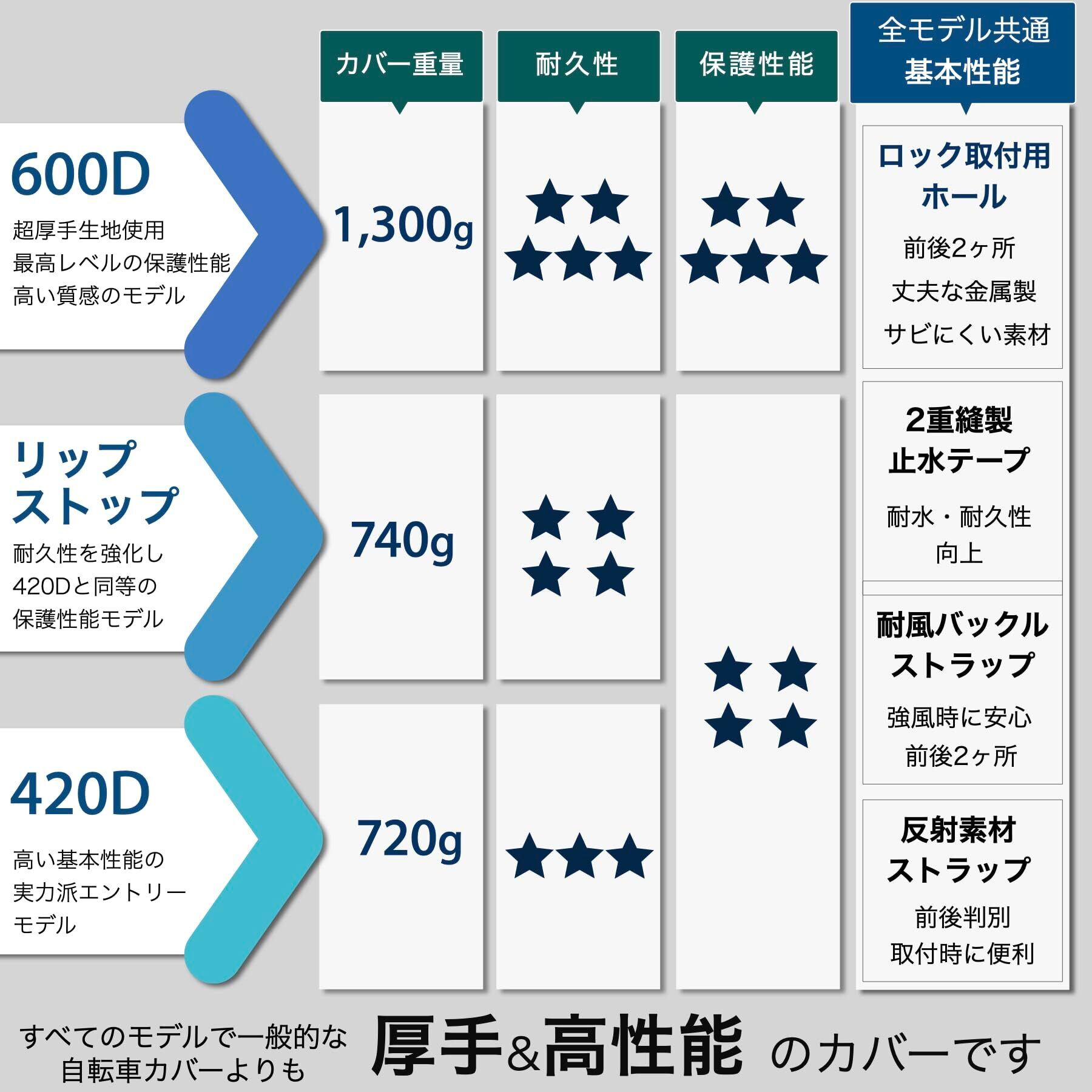 最高レベルの保護力と耐久性 | 丈夫で耐久性の高い超厚手の600デニールオックスフォード生地を使用。自転車用のカバーとしては最上位クラスの他にない厚さの丈夫な生地。大事な自転車を守るのに最適。