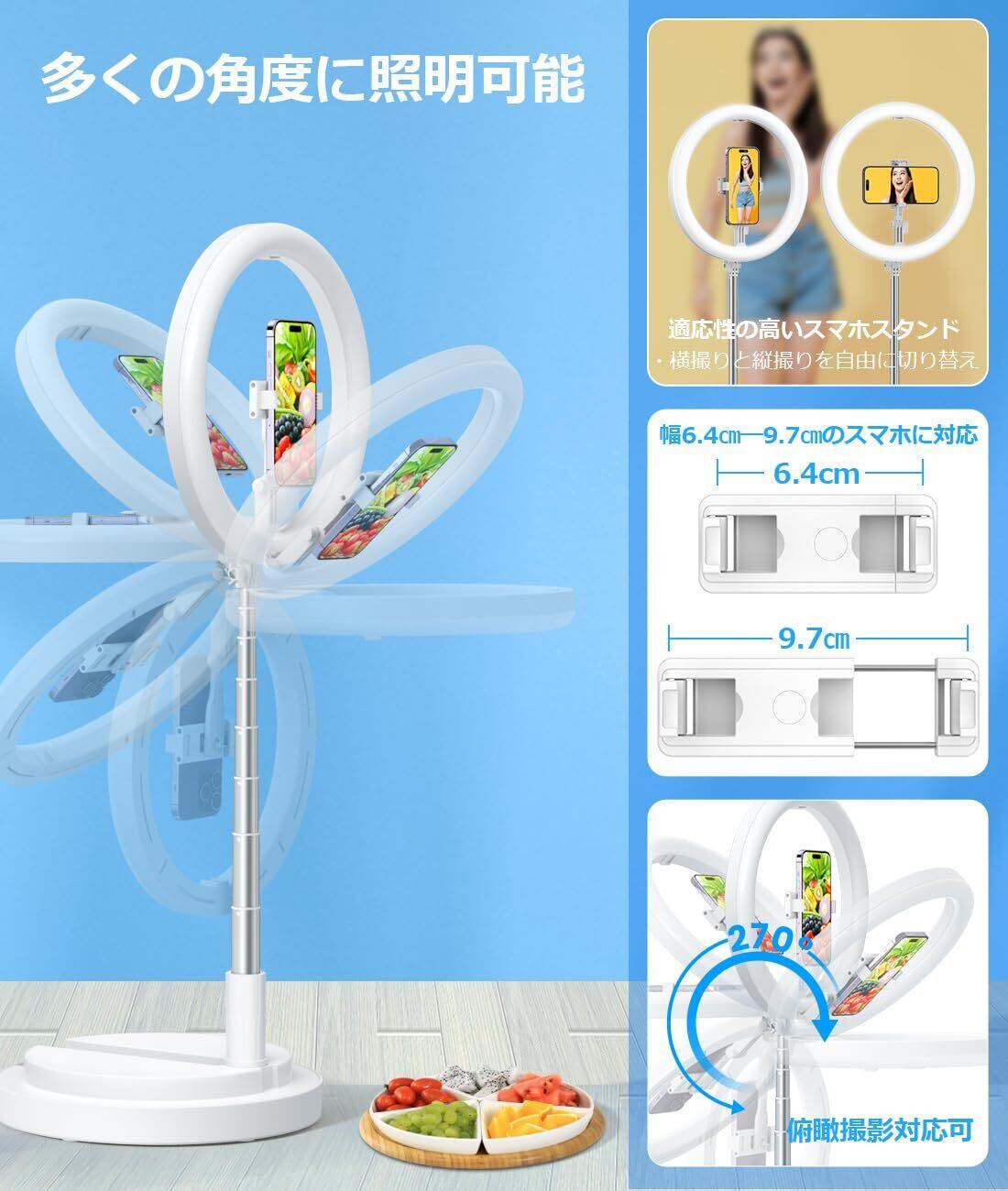 ✨【自由に角度調整可能・8段階伸縮スタンド仕様】リングライトは180°回転させることができます。搭載されているスマホスタンドも360°回転できるので縦写真でも横写真でもお好きな角度で撮影できます。また、このリングライトは8段階の伸縮スタンド仕様です。高さは52cmから168cmまで調節でき、撮影ライトとして顔から全身まで照明をあてることができます。卓上や地面両用でき、シーンに合わせて、誰でも楽にご使用頂けます。テーブルや台座などに置いて静物を撮ったり、テレワーク会議をしたり、床や地面に直接設置して生放送してもぴったりです。USB給電なので、場所を選ばず活用できる撮影照明ライトです。