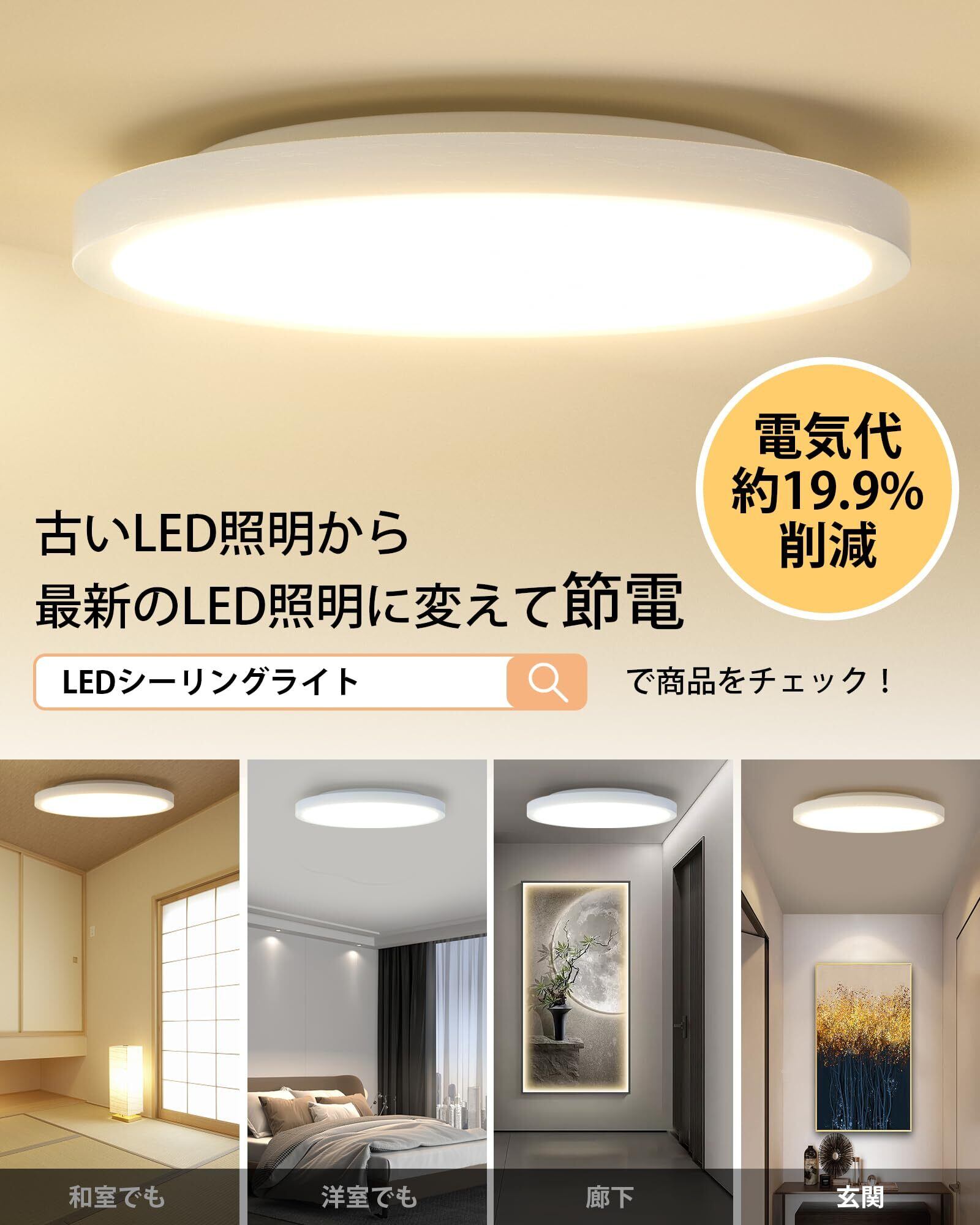 【節電・高輝度・超薄型スタイリッシュ天井照明・高発色・防虫・防塵】led シーリングライトは、高発光率LEDレンズを使用しています。28Wの低消費電力で3600lmの高輝度のシーリングライト 6畳です(シーリングライトの明るさは蛍光灯の2倍で、電力料金は半分です)。6畳から8畳のお部屋向けとなっています。シーリングライトおしゃれは、厚さ2.5cmの超薄型デザインと白いフレームの組み合わせを採用し、スタイリッシュで広々とした空間を演出します。色温度は2700K~6500Kで、ウォームライト、クールホワイト、中間色ライトの3つの異なるカラーが徐々に変化し、食品や花などをより暖かく鮮やかに見せるなどの効果があります。シーリングライトの波長は昆虫を引き寄せないため、シーリングライトの中に虫が入り込んでライトが汚れてしまうこともありません。そのため掃除の回数が減るというメリットもあります。